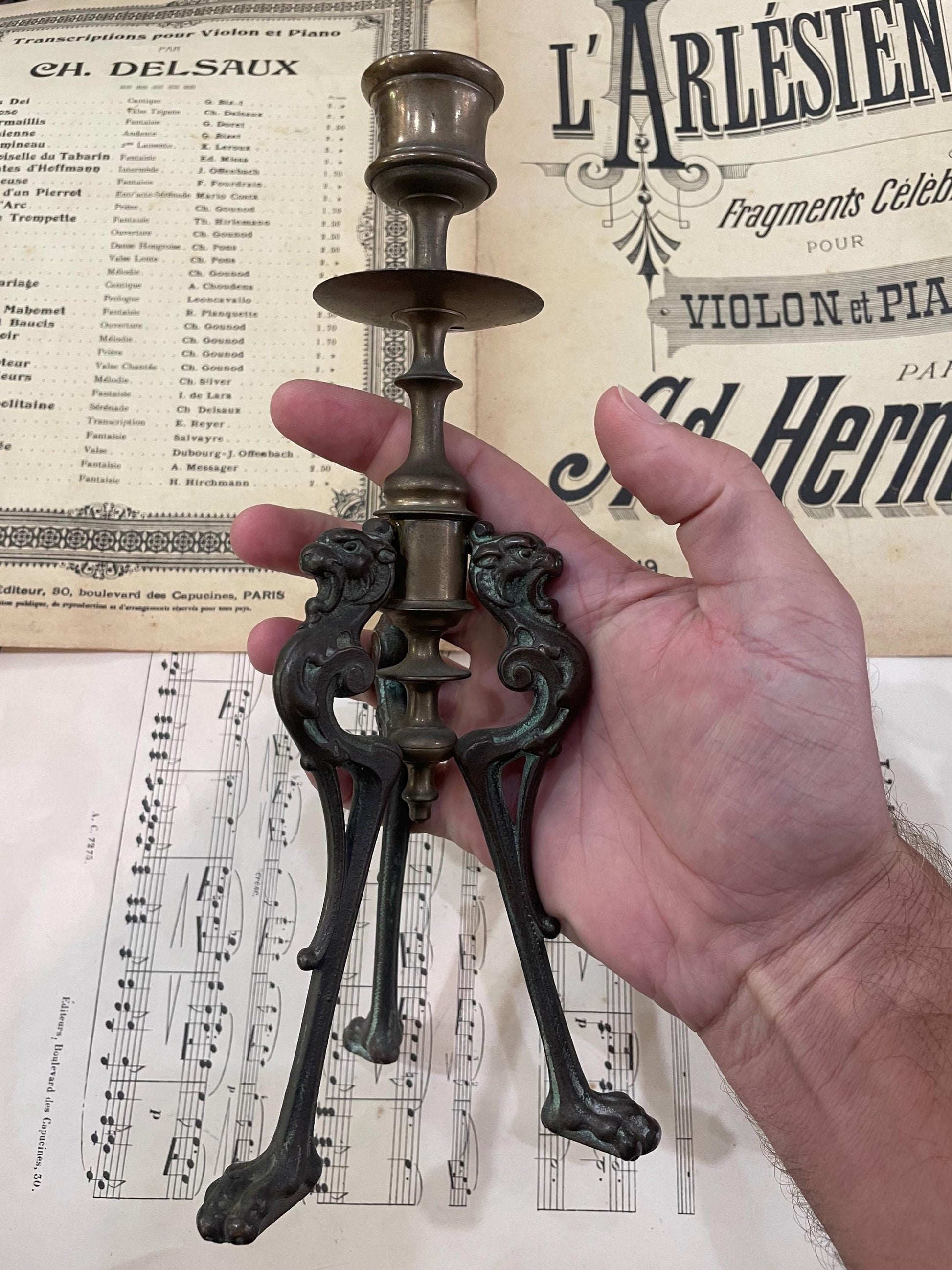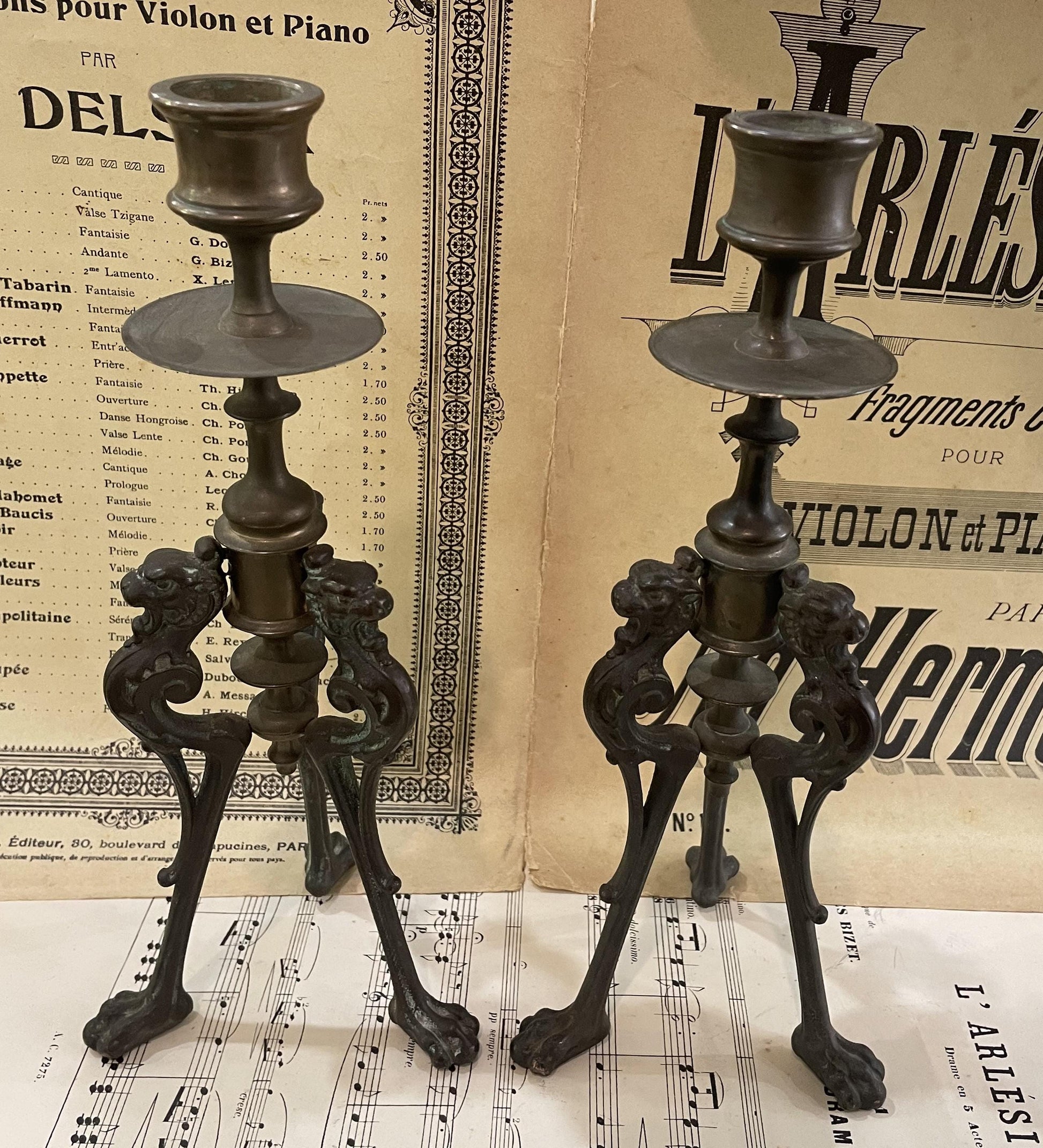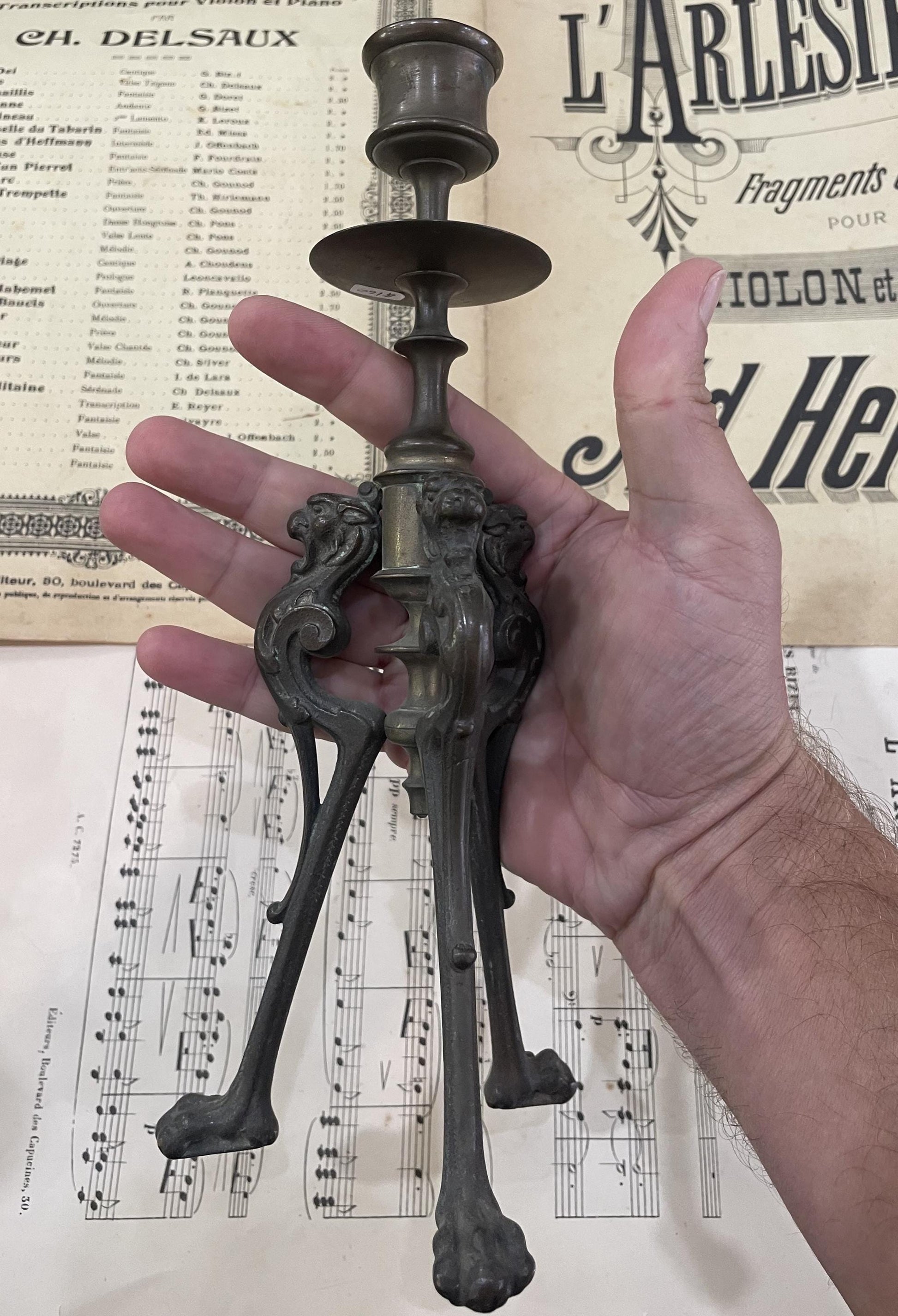 Antique French Art Nouveau Bronze Candlestick Holders Lions c1880. They are in good condition for their age.