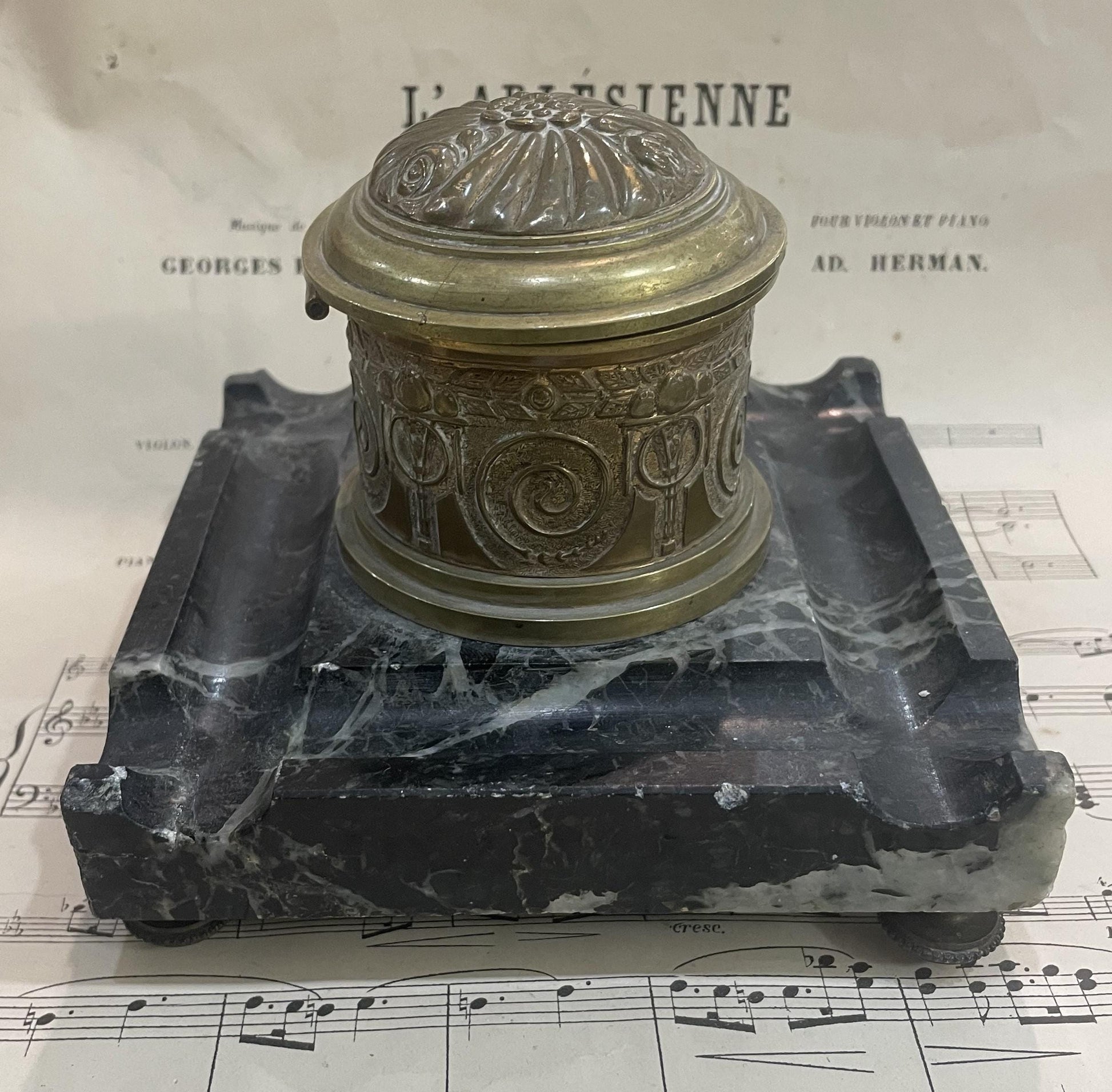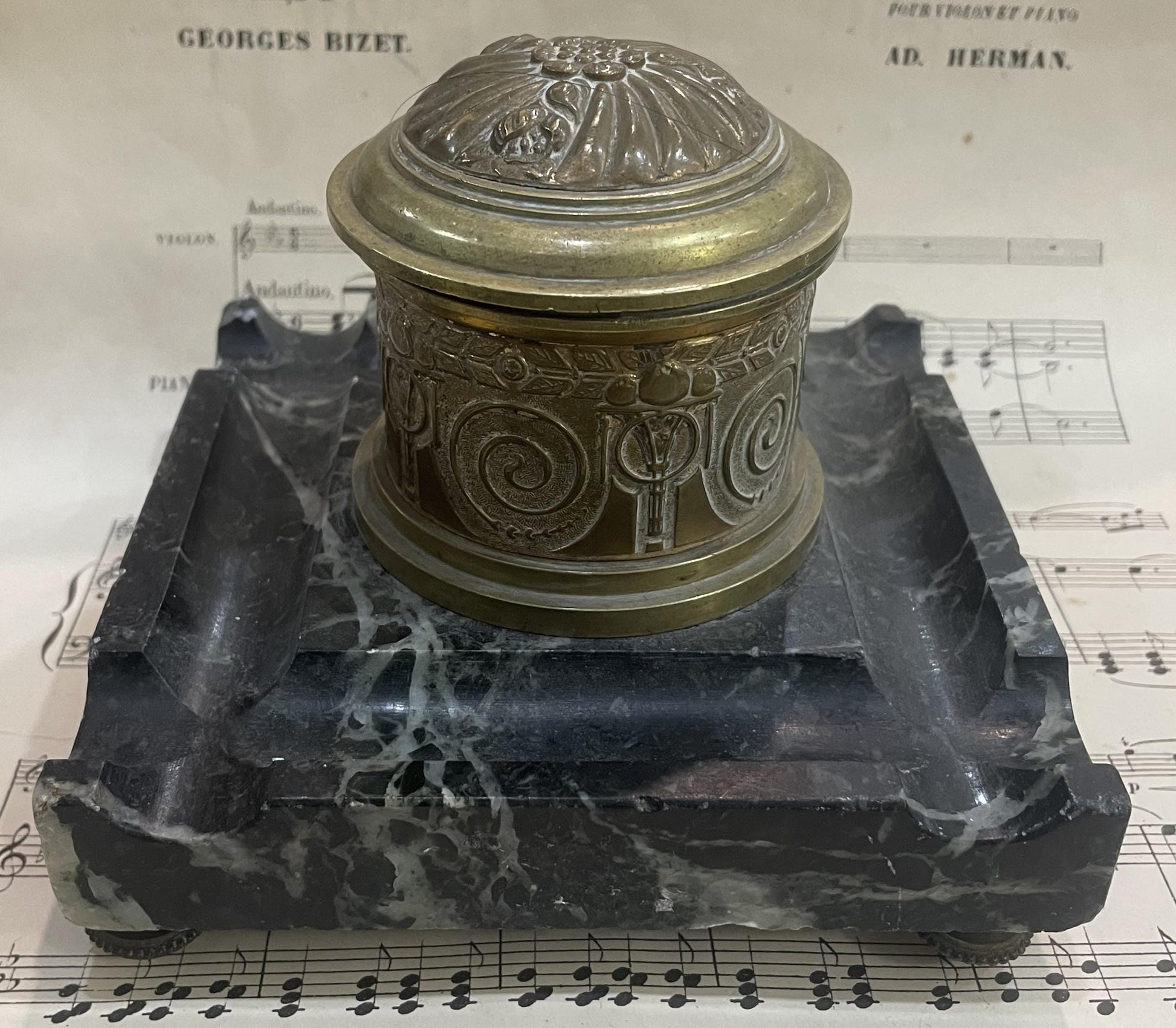 Antique French Art Nouveau Bronze Marble Inkwell c1900