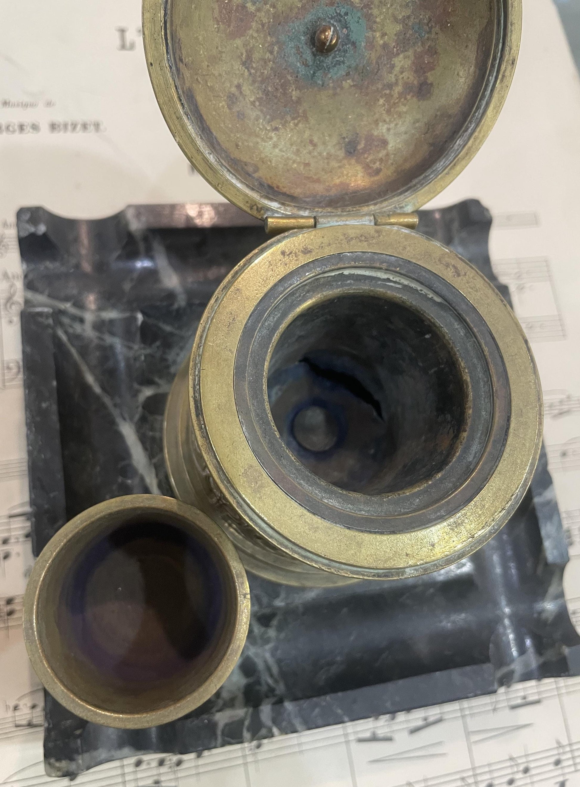 Antique French Art Nouveau Bronze Marble Inkwell c1900. There are many small chips on the marble edges (see photos) and there is a hole at the bottom of the main receptacle below the small cup (see 7th photo). All in all in decent condition for its age.