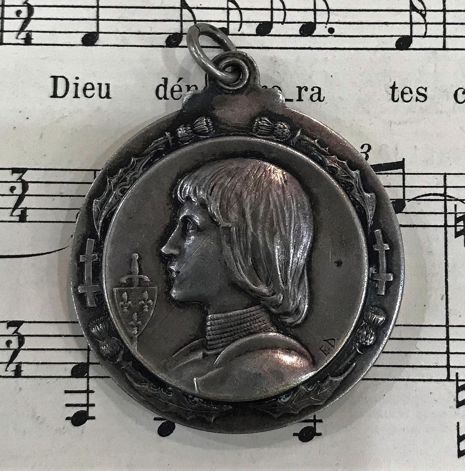Antique French Art Nouveau Joan of Arc Thistle Sliding Mirror Pendant c1900