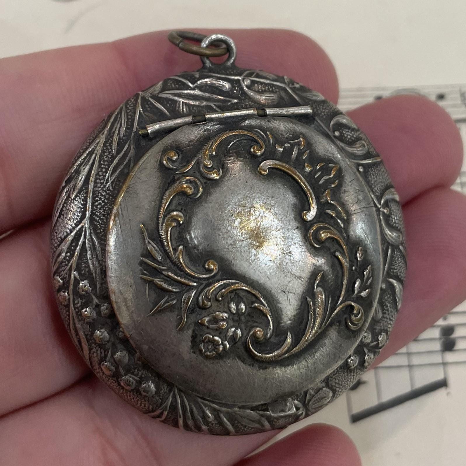 Antique French Art Nouveau Silver Plated Pill Box Compact Rouge Flowers Mistletoe c1900. A little bit of wear but overall in good condition.