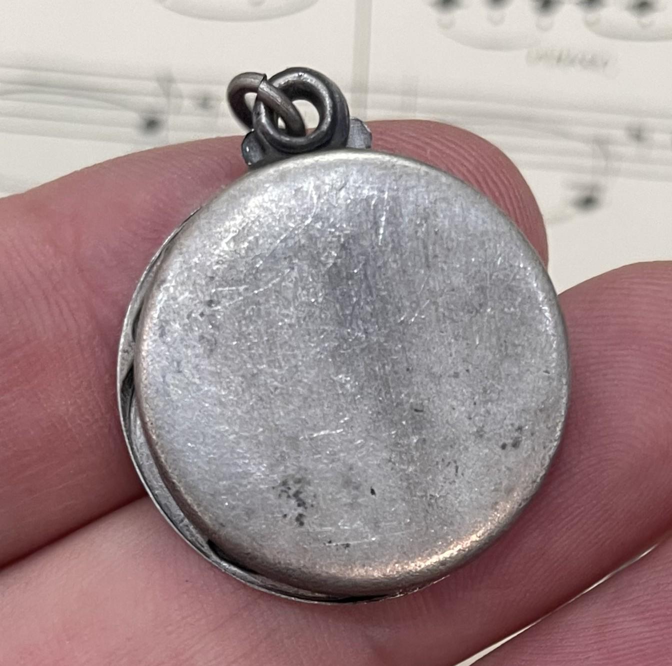 Antique French Art Nouveau Sliding Pendant Photo Holder Cherry c1920. It slides open to show a compartment where a small photo can be displayed. This is from an old uncirculated stock. It's in good condition.