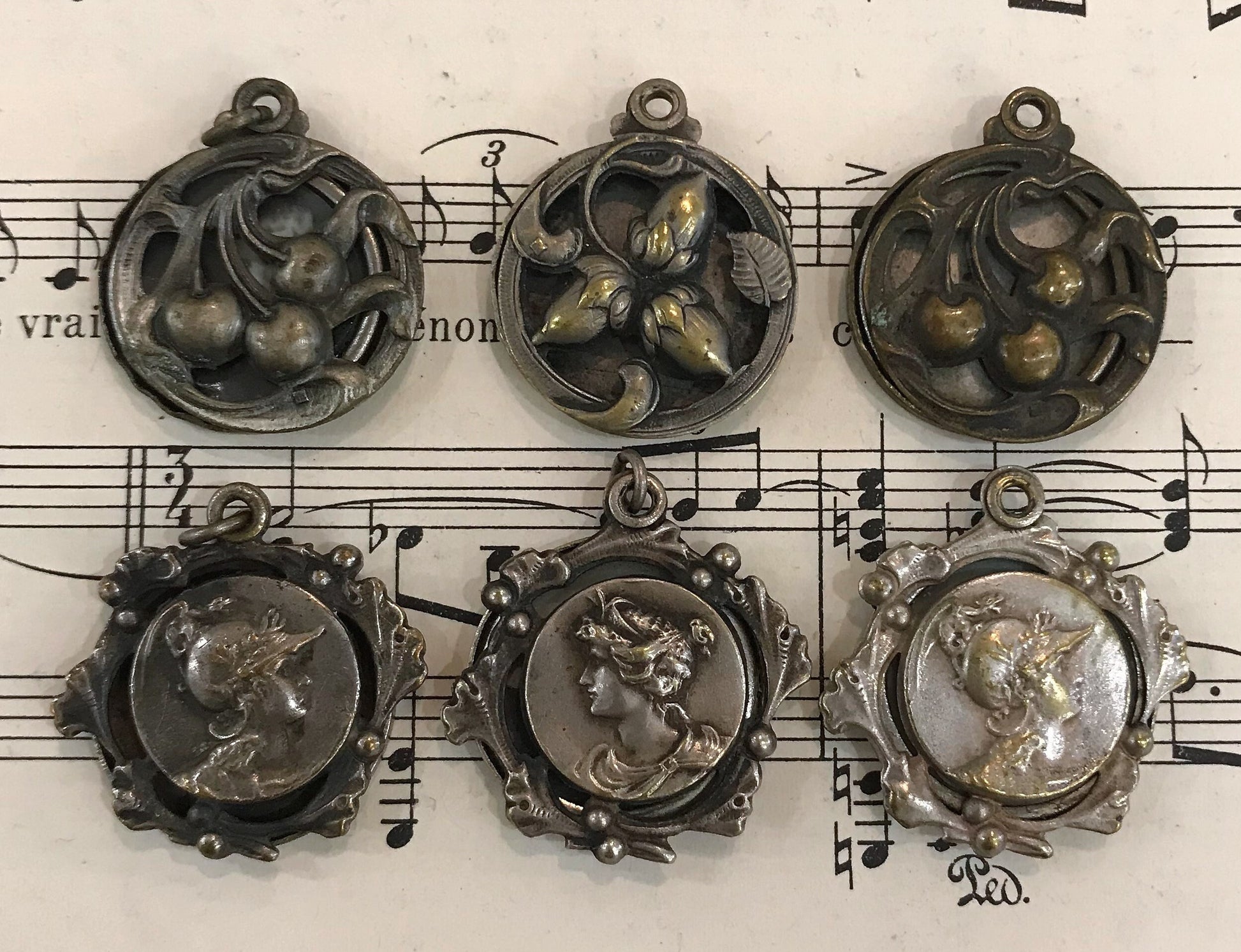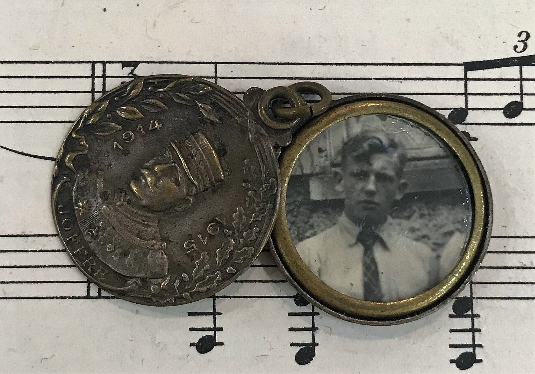Antique French Art Nouveau Sliding Pendant Photo Holder Marshal Joffre WWI c1920. It slides open to show a compartment where a small photo is present. It's in good condition for its age.