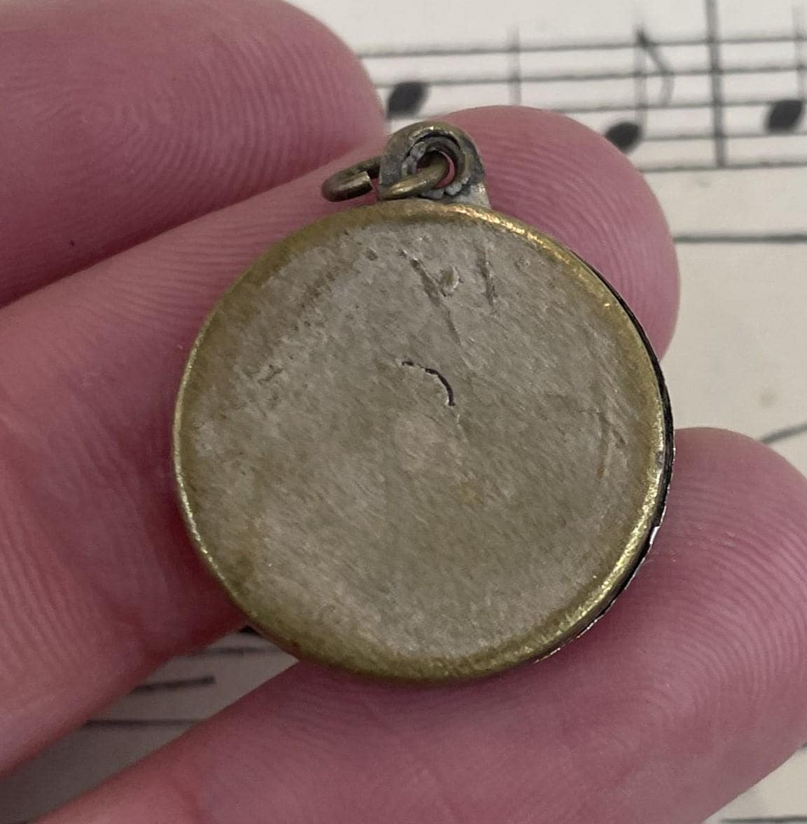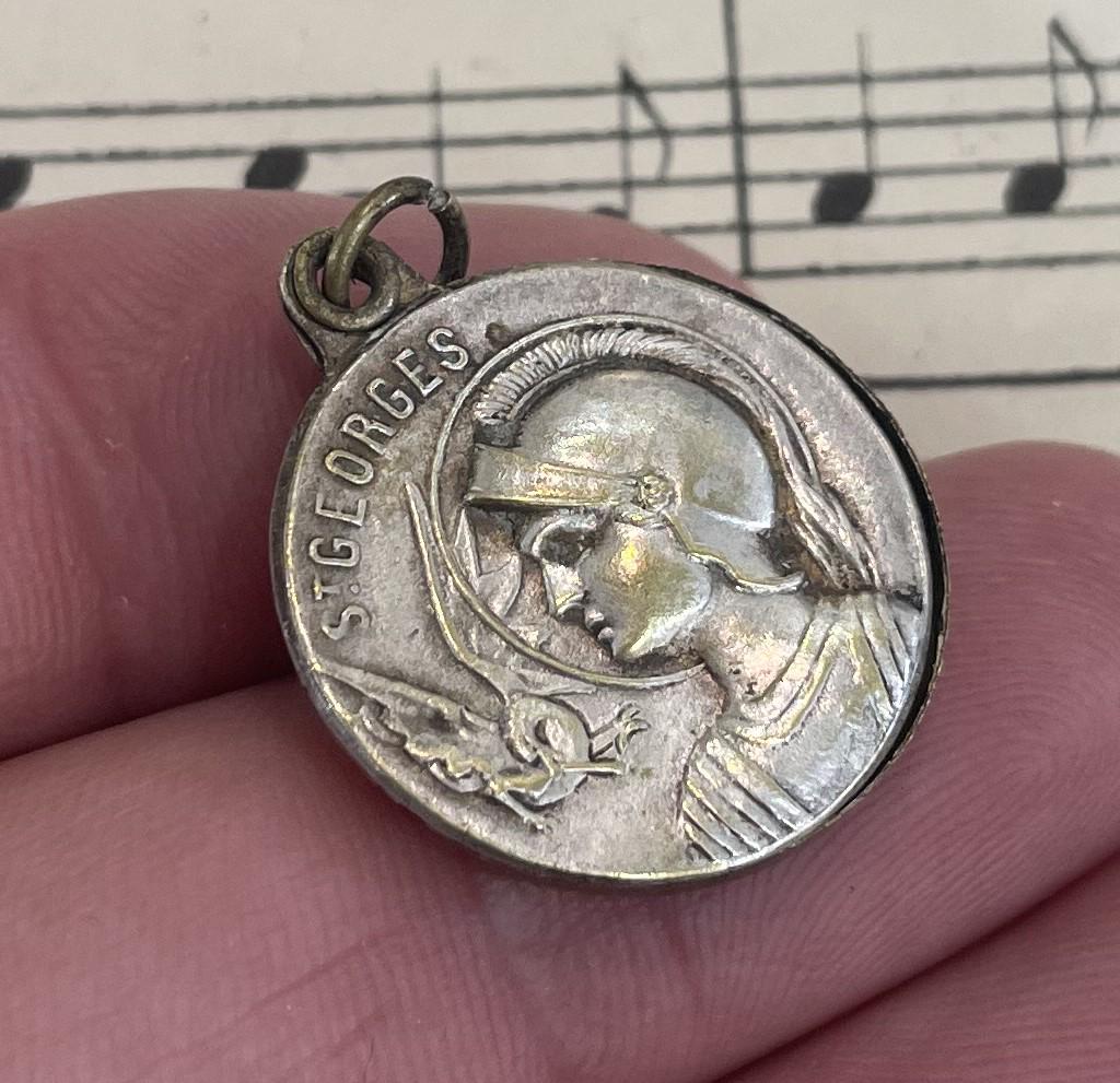 Antique French Art Nouveau Sliding Pendant St George c1920. It's silver plated. A small scratch and some wear on the back. It's in good condition for its age.