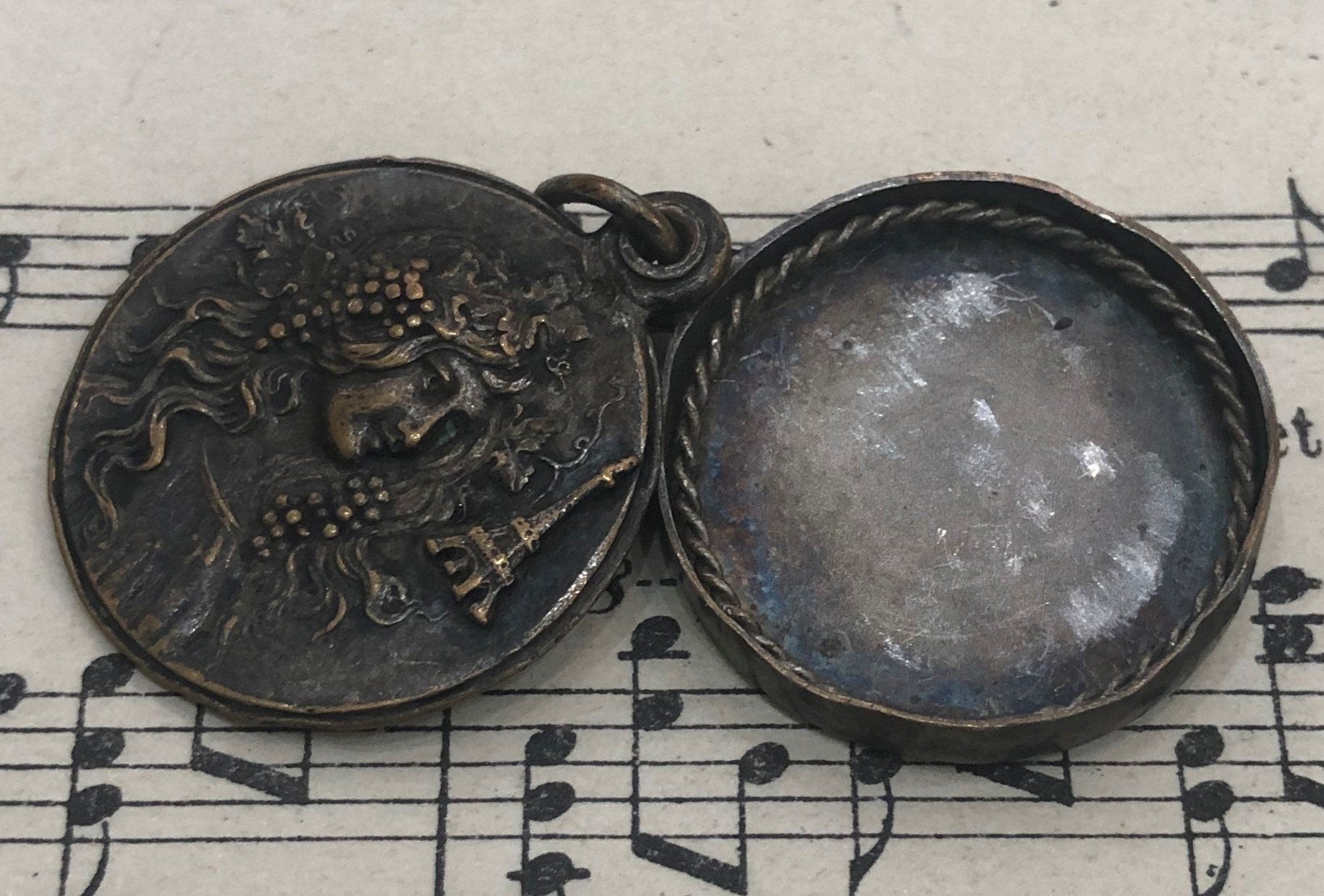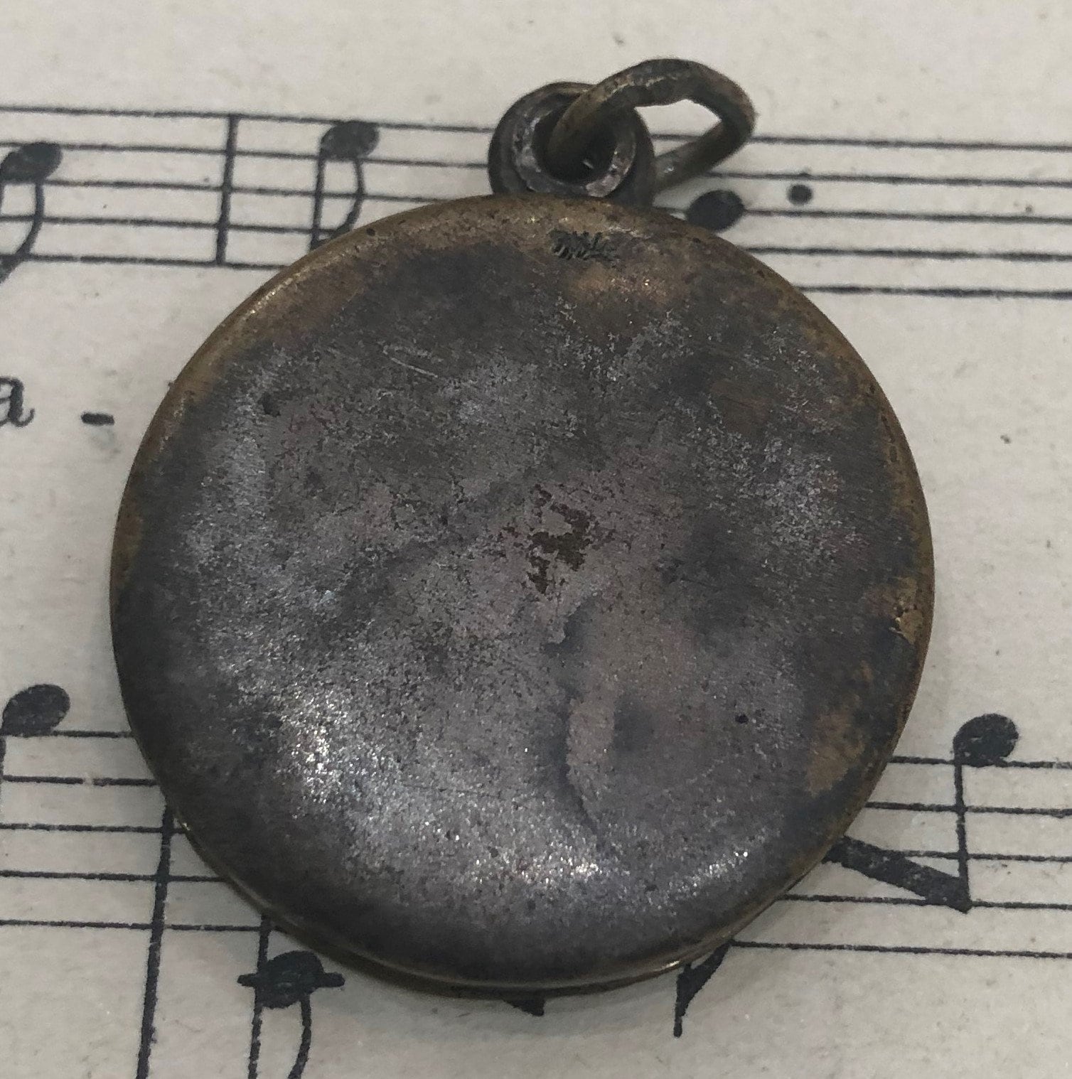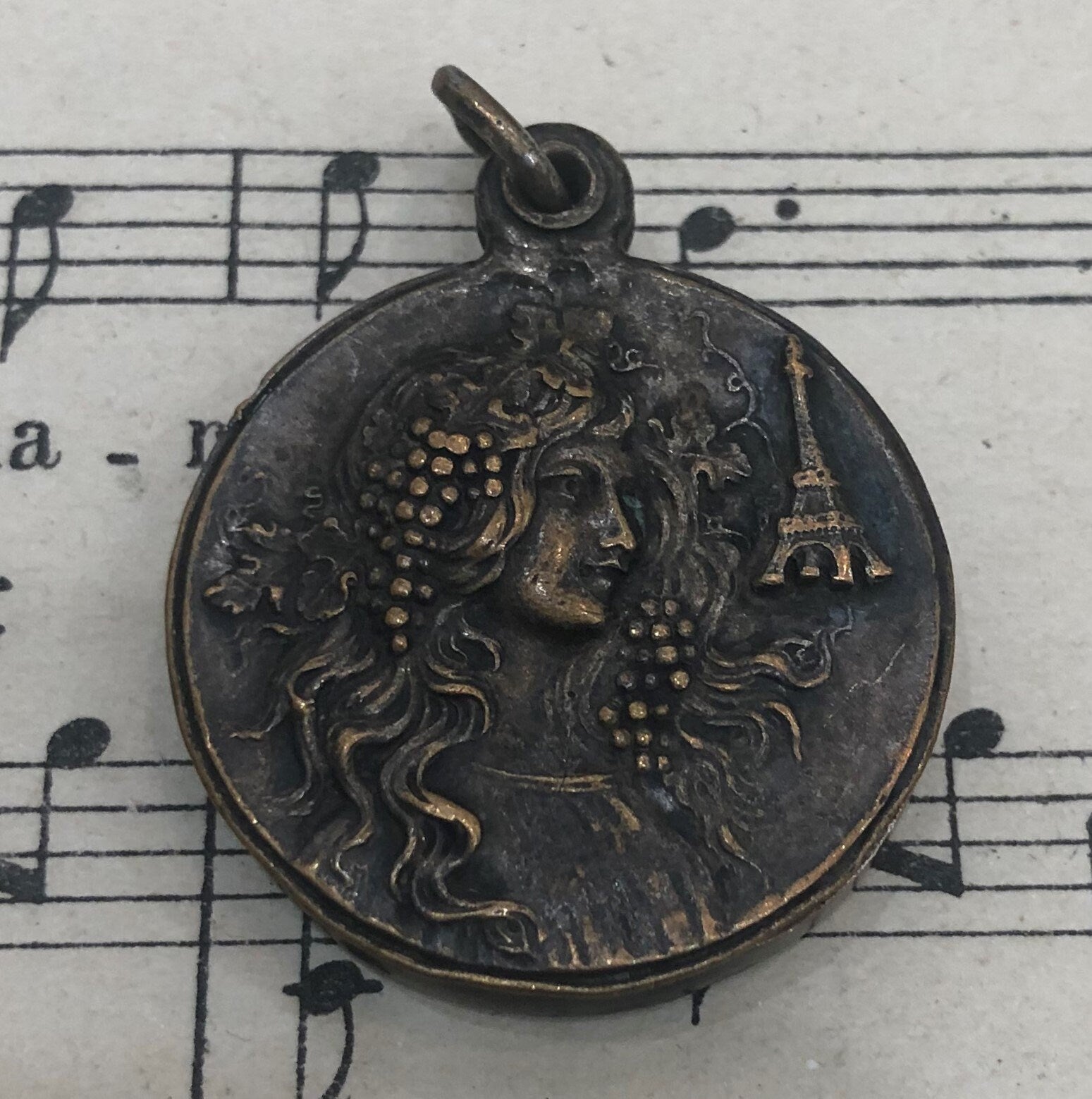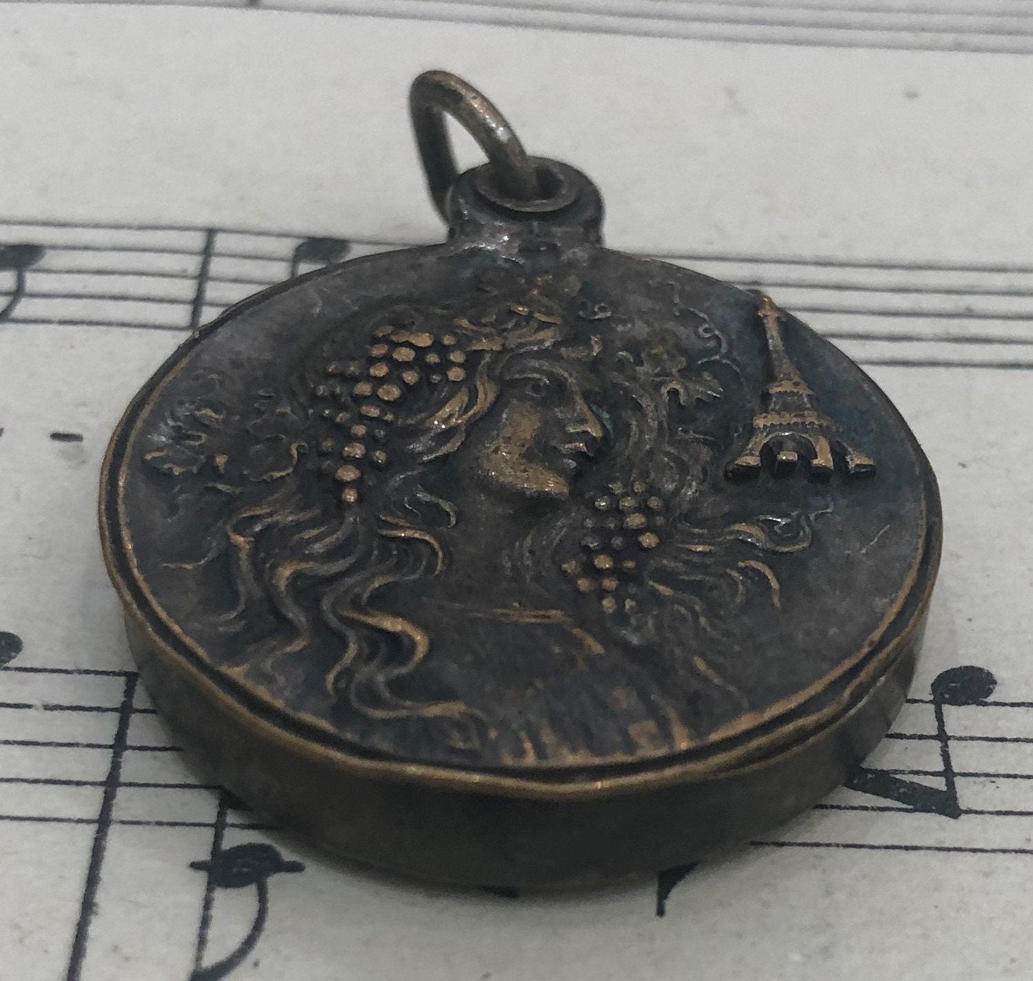 Antique French Art Nouveau Sliding Pendant Woman Eiffel Tower c1920. It slides open to reveal a ring that can be used to hold a photo in the compartment. It's in good condition for its age.