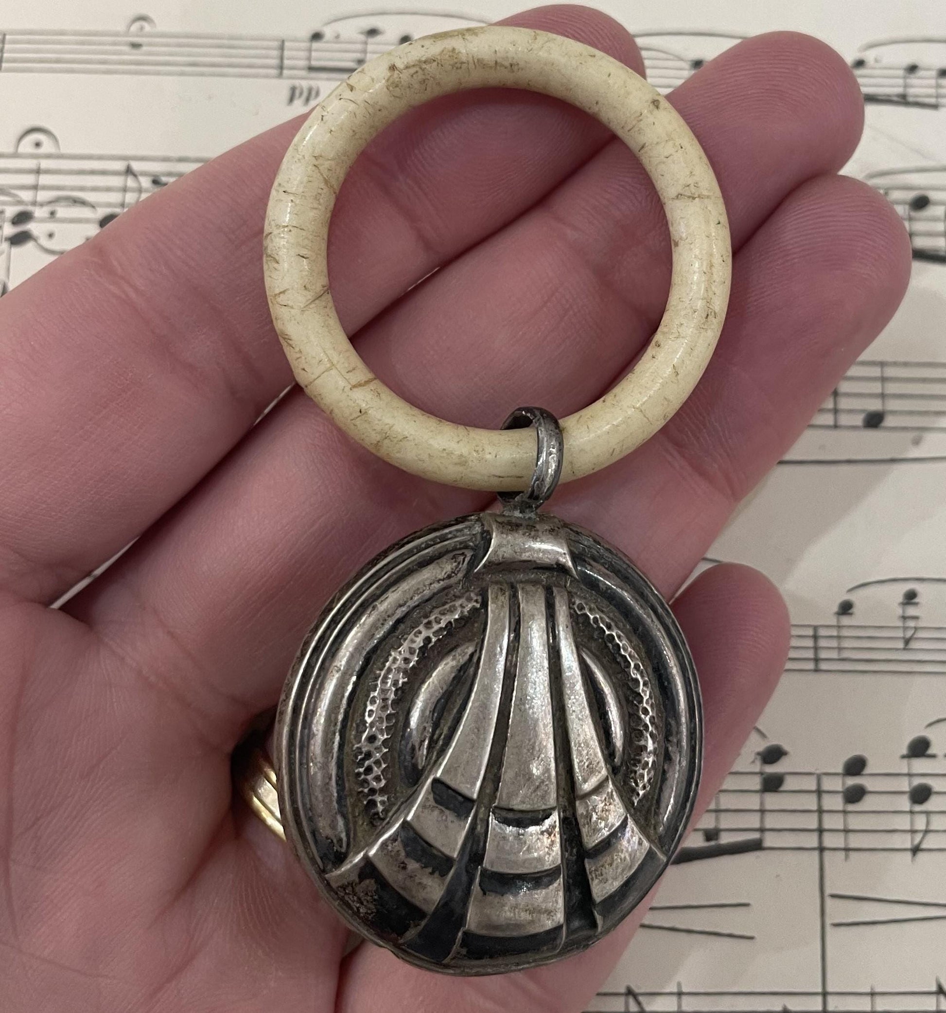 Antique French Art Nouveau Sterling Silver Baby Rattle c1900. It has the sterling silver French hallmark on the bail (boar's head). It's in good condition for its age!