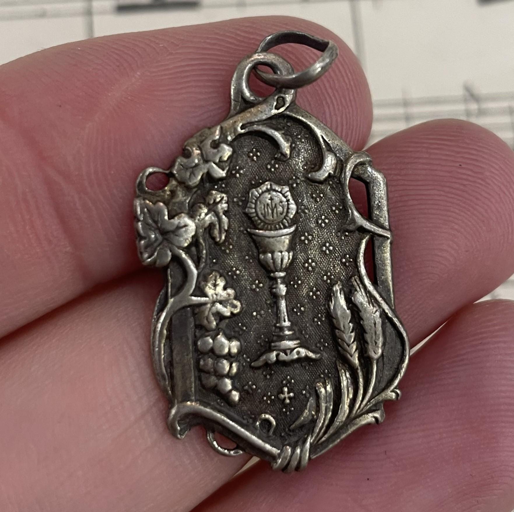Antique French Art Nouveau Sterling Silver First Communion Medal Chalice c1911. It has the French hallmark for sterling silver (boar's head). Engraved on the back "Charlotte Doudelet 11 Juin 1911" (Charlotte Doudelet June 11th 1911). It has a scratch on the back (see photo). Overall in good condition.