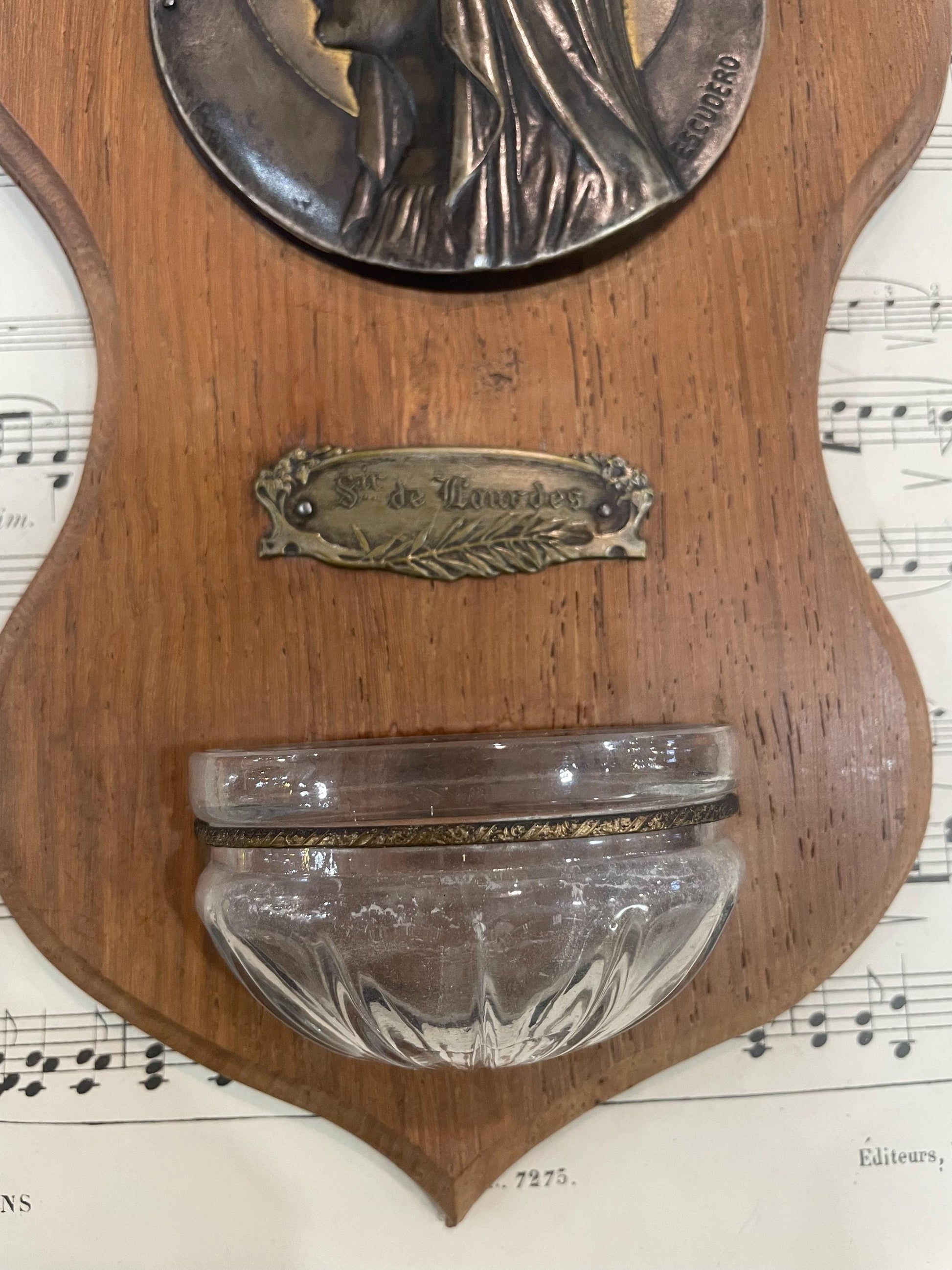 Antique French Art Nouveau Wooden Signed Holy Water Font Lourdes Virgin Mary c1920. Signed by Escudero. A little bit of wear (see photos) but overall in good condition for its age.
