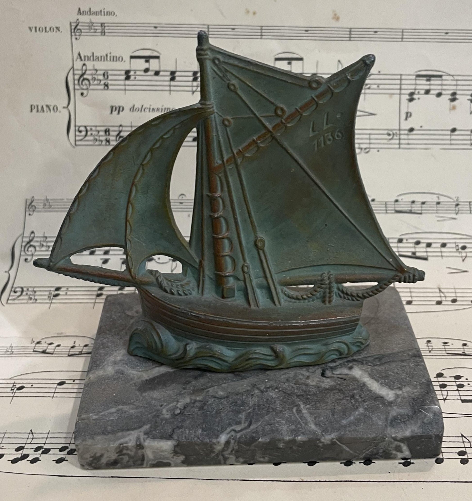 Antique French Boat Sculpture on Marble c1940. A small chip on the back right corner (see photos). It's in good condition for its age.