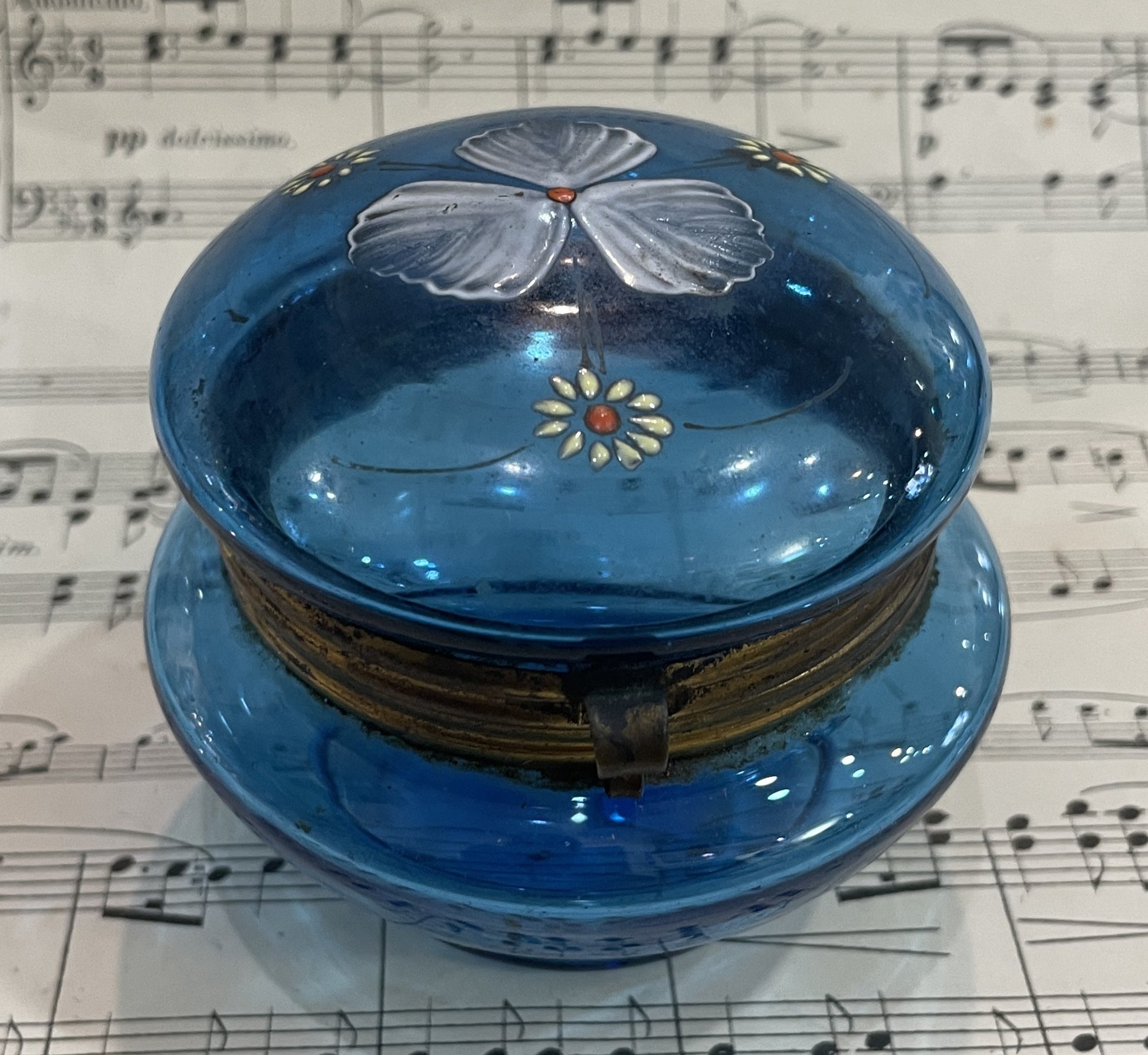Antique French Gilt Brass Blue Glass Hand Painted Enameled Box Flowers c1900. It's in good condition for its age.