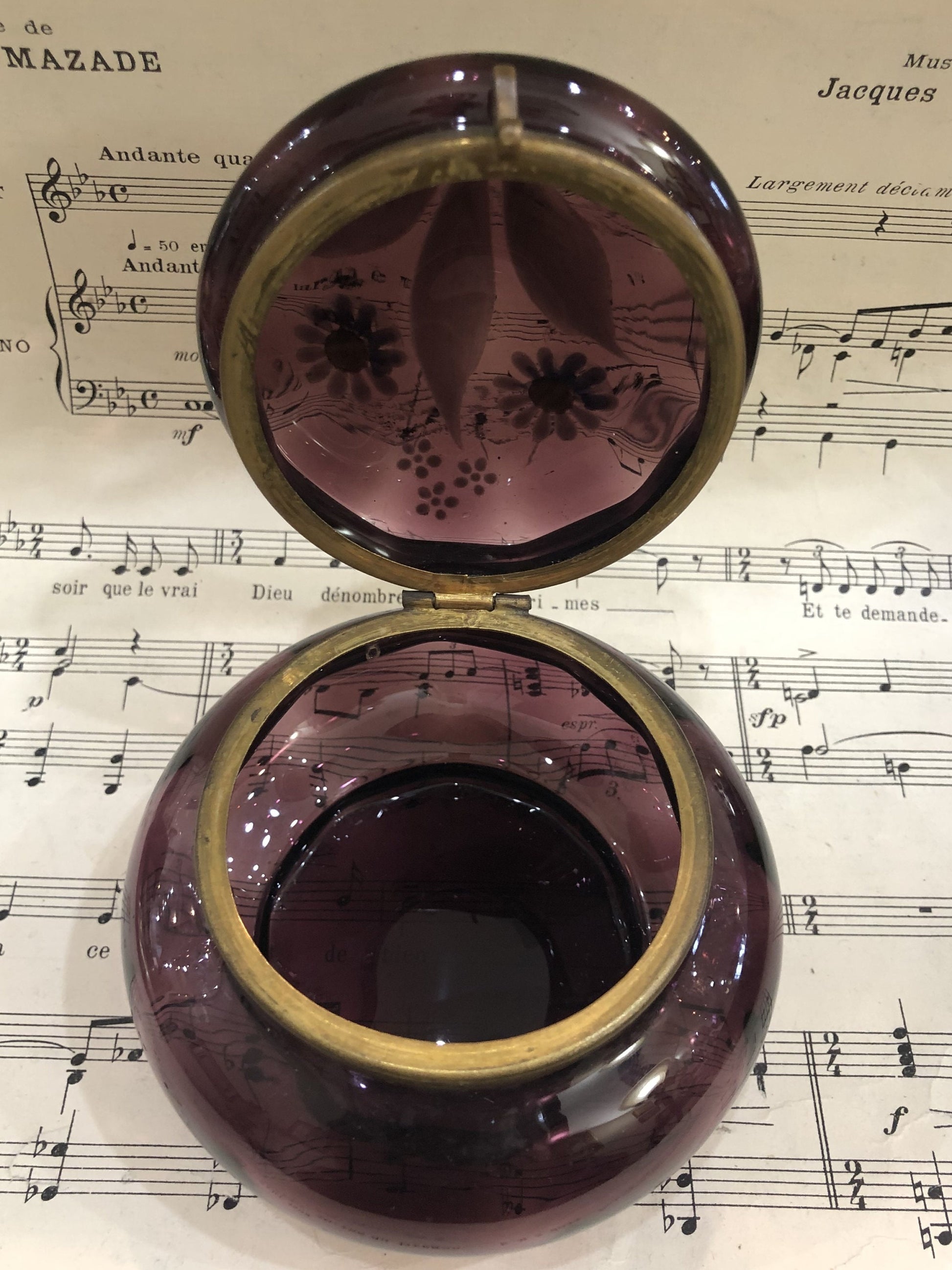 Antique French Gilt Brass Purple Glass Hand Painted Enameled Box Flowers c1900. A little bit of wear. It's in good condition for its age.
