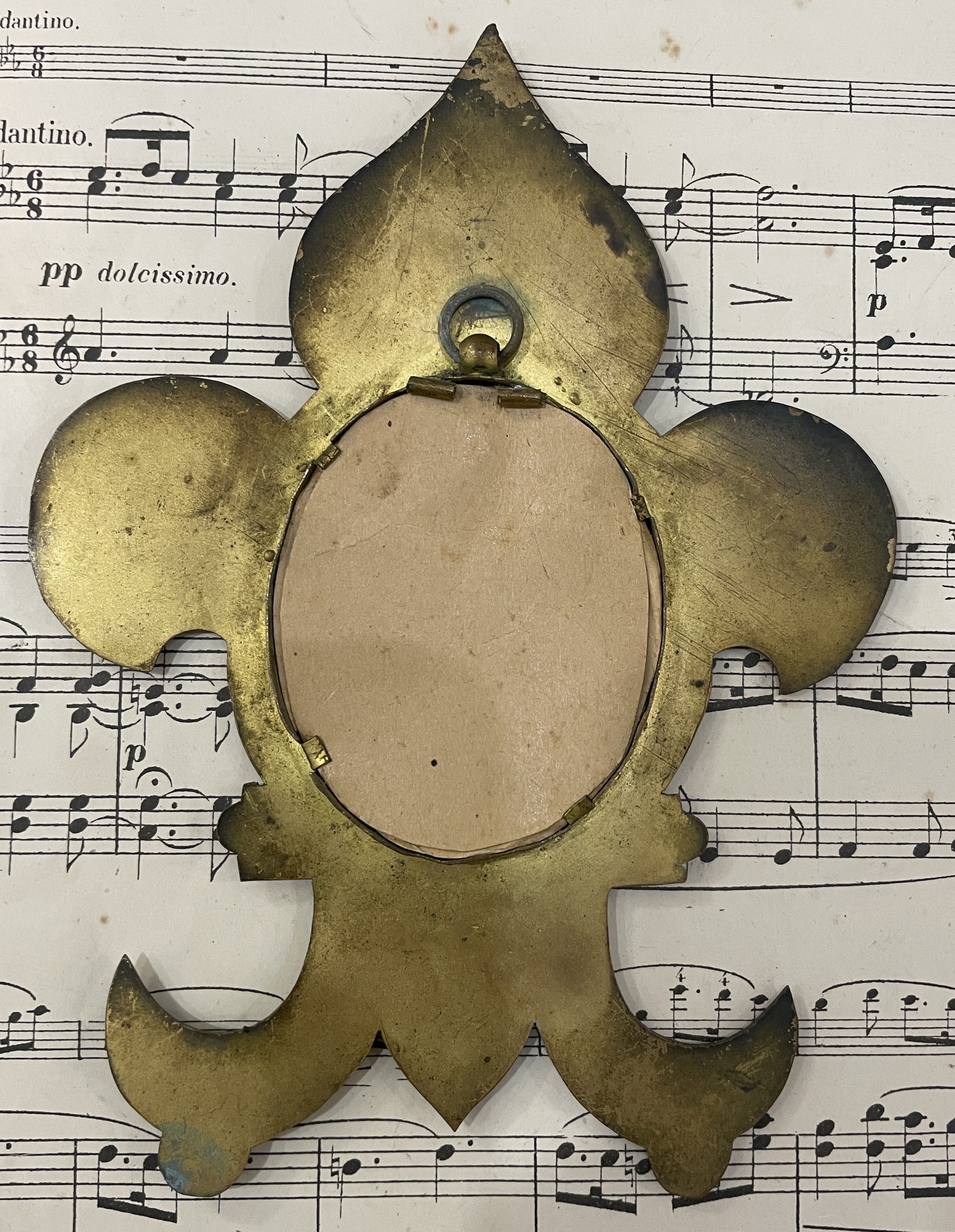 Antique French Hand Painted Porcelain Religious Fleur de Lys Mary Jesus c1880. It has a hand painted porcelain of Notre Dame des Victoires. It's in good condition.