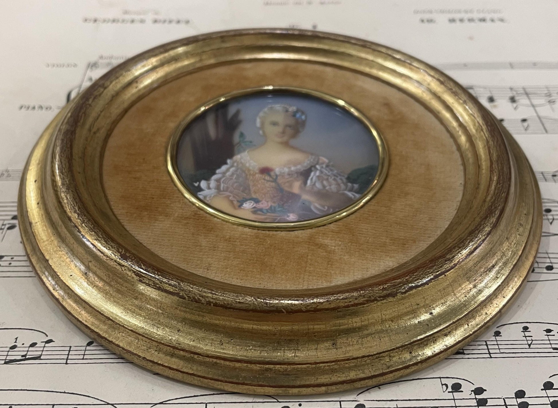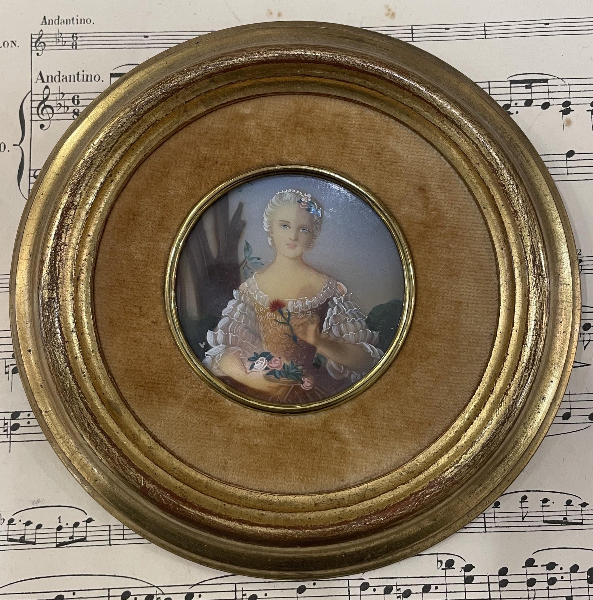 Antique French Miniature Woman Portrait Velvet Glass Roses c1920