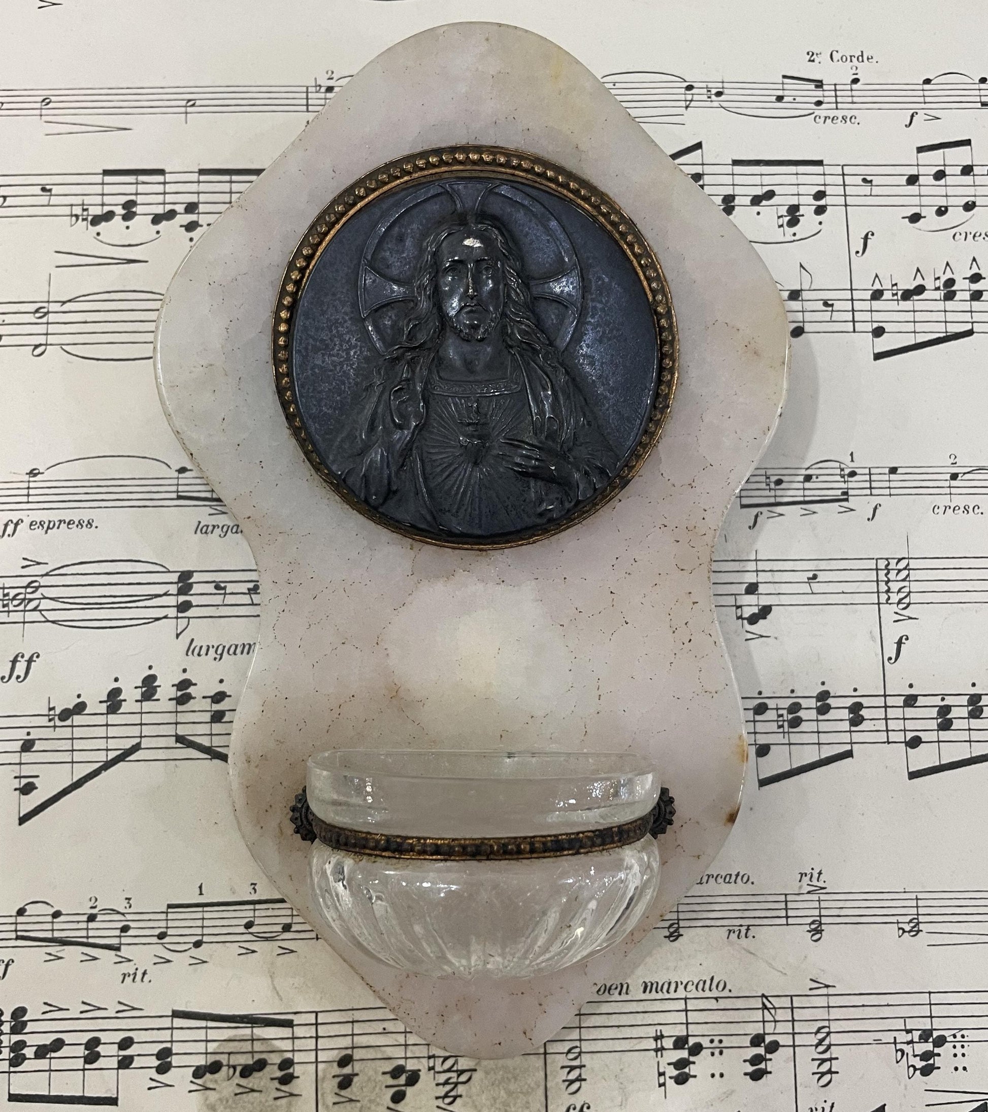 Antique French Onyx Holy Water Font Jesus Sacred Heart Signed Ruffony c1910