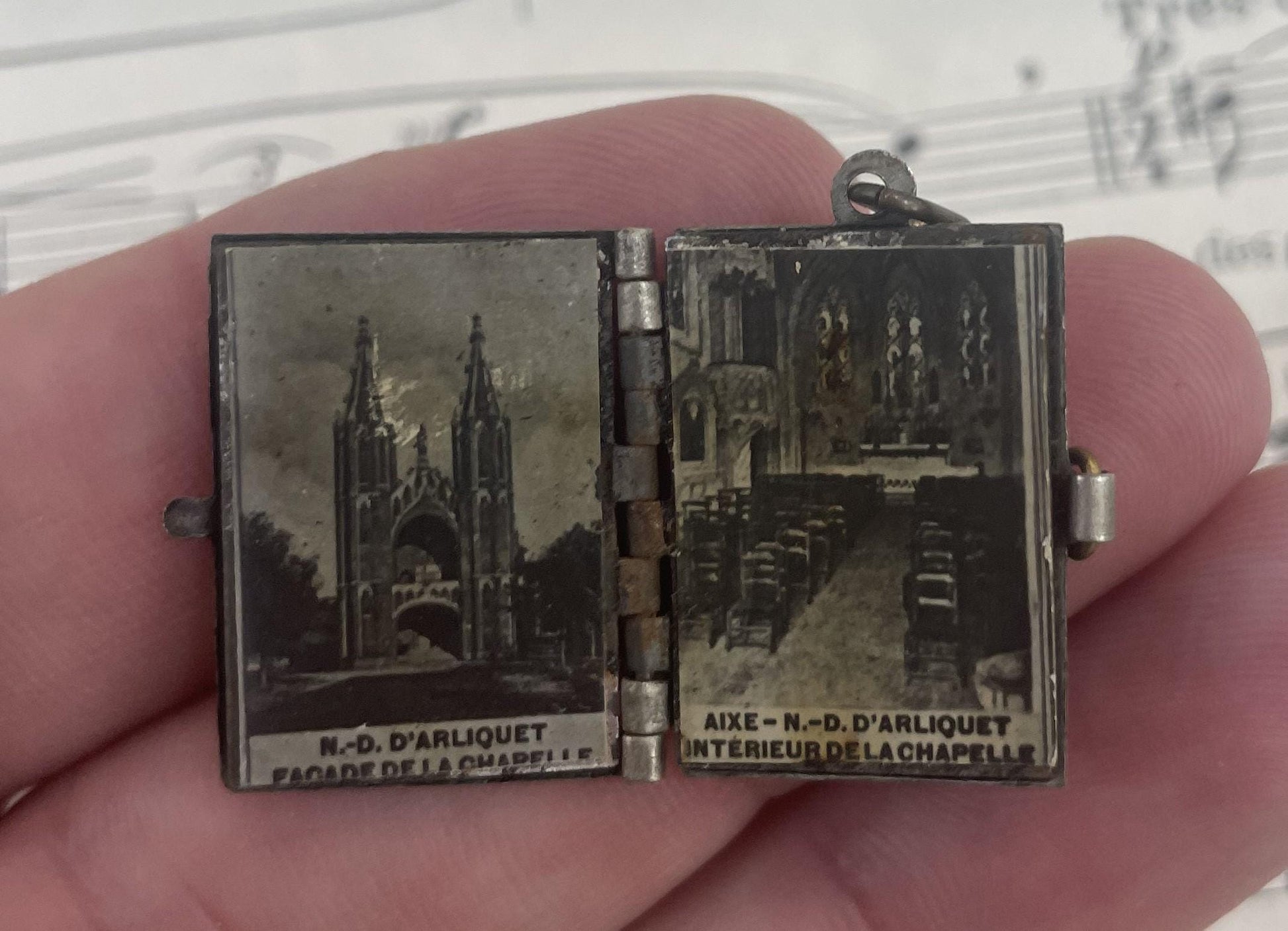 Antique French Souvenir Photo Book Pendant Locket Notre Dame d'Arliquet c1920. It contains 6 original photographs. It's in good condition for its age!