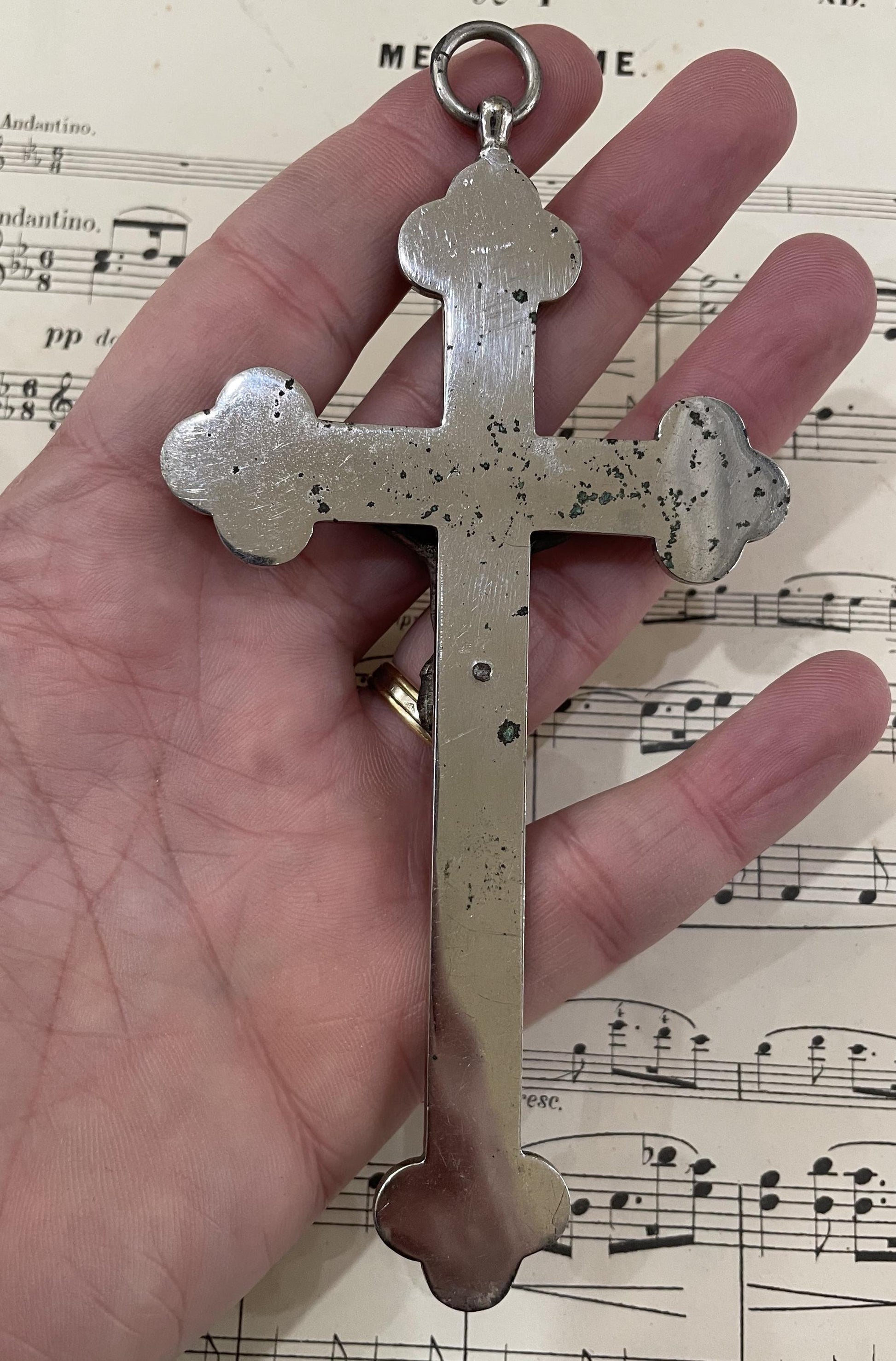 Antique Italian Micro Mosaic Micromosaic Cross Crucifix Bird Chalice Jubilee c1887. A little bit of oxidation on the metal. It's in good condition.
