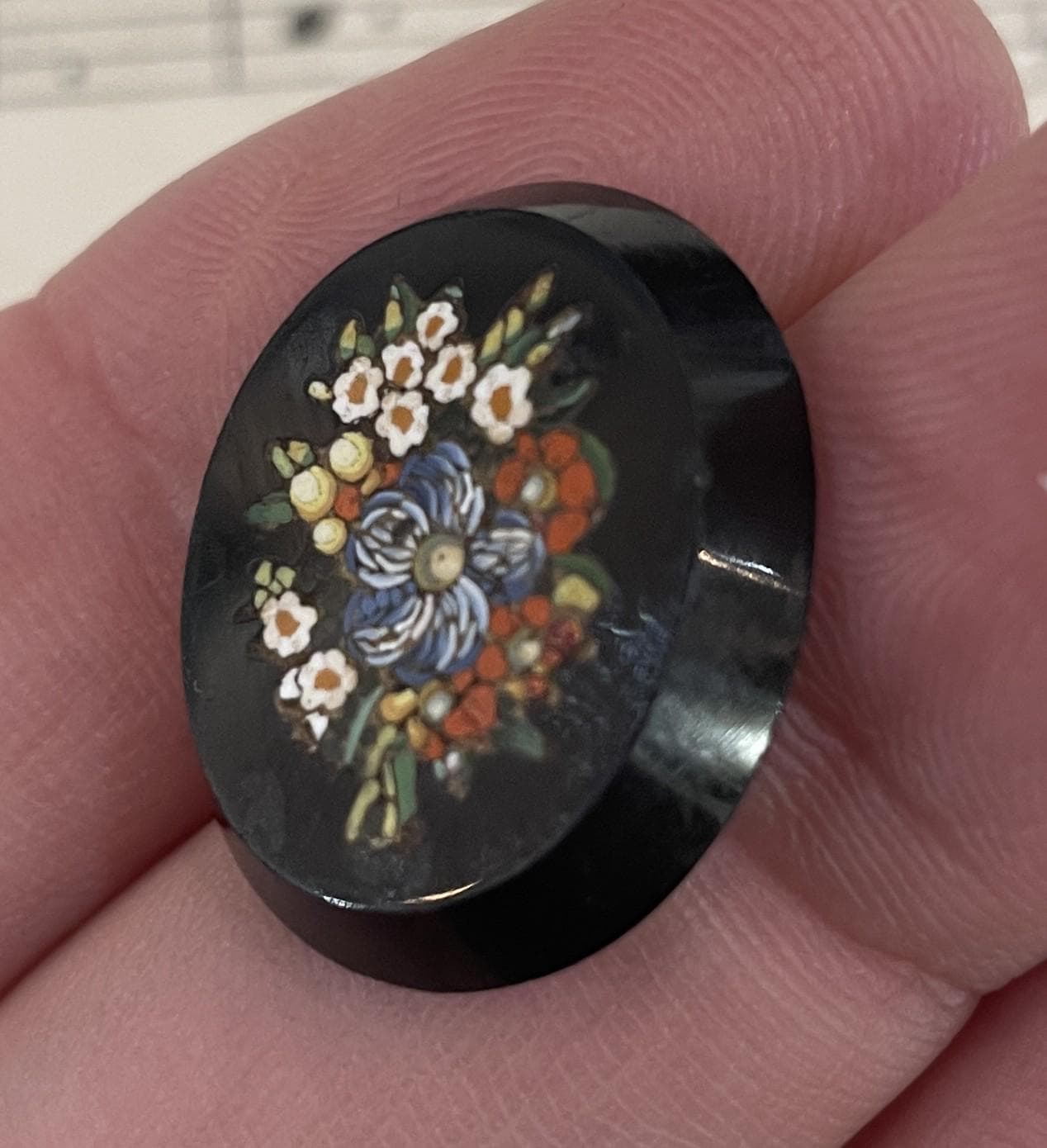 Antique Italian Micro Mosaic Micromosaic Plaque Flowers Millefiori c1880. It has a flea bite on the edge of the stone on the right, barely noticeable in person (see photos). Overall in good condition for its age.