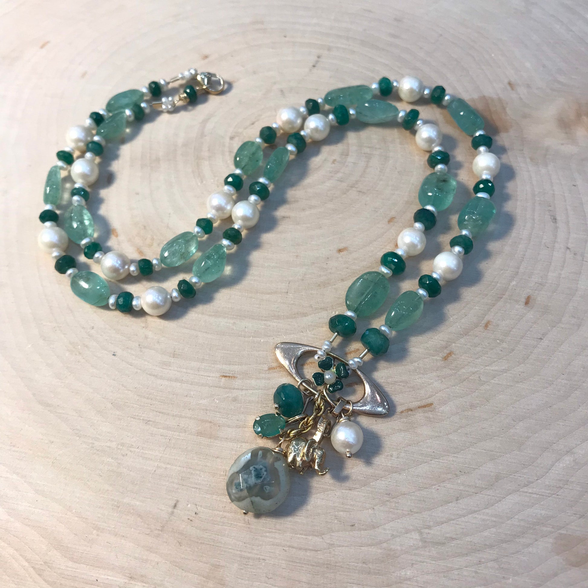 The Art Nouveau 14k gold necklace is made with emeralds, freshwater and Akoya cultured pearls, an antique art nouveau 14k pendant with an enamel and pearl four leaf clover, a tiny 14k gold elephant charm and all 14k gold components.