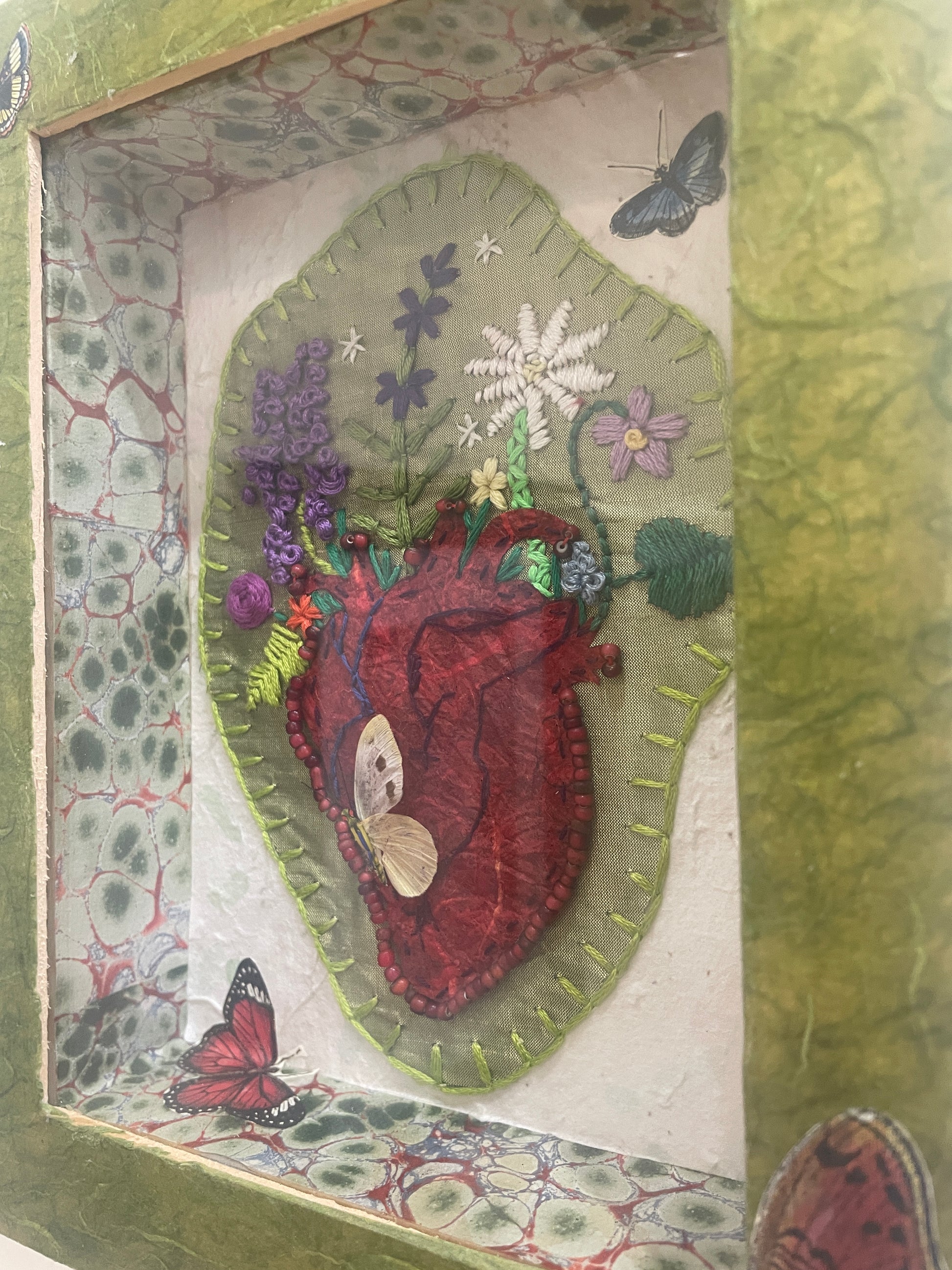"Be Still My Heart" shadowbox is made with handmade paper, butterfly wings, embroidery on silk, antique white heart beads, hand marbled French paper and a wooden shadowbox frame. I wanted to express the feeling of flutters in the heart when one falls in love, how gardens blossom from our inner longings and how fragile it can all be. Take care of your heart and the hearts of others.