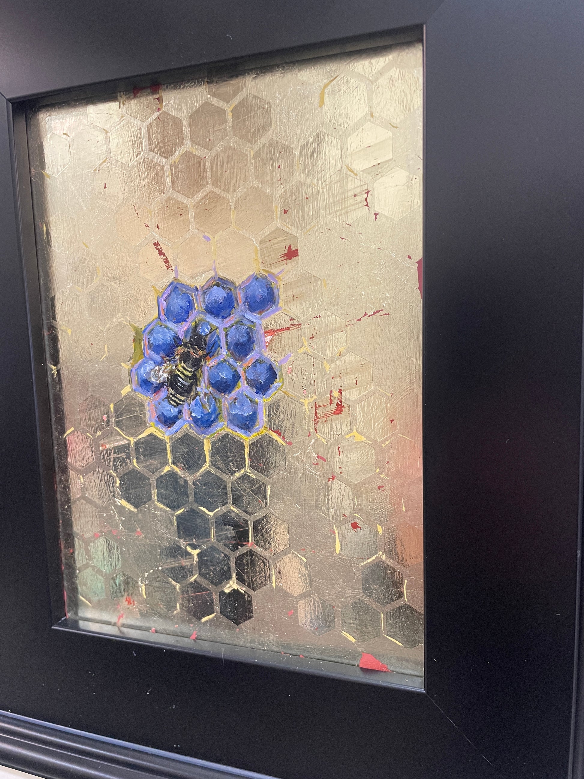 Blue Honey - Original Framed Oil and Gold Leaf on Board Painting by Mercurial Muse