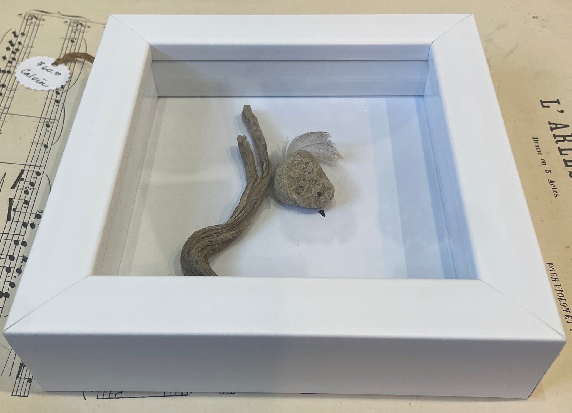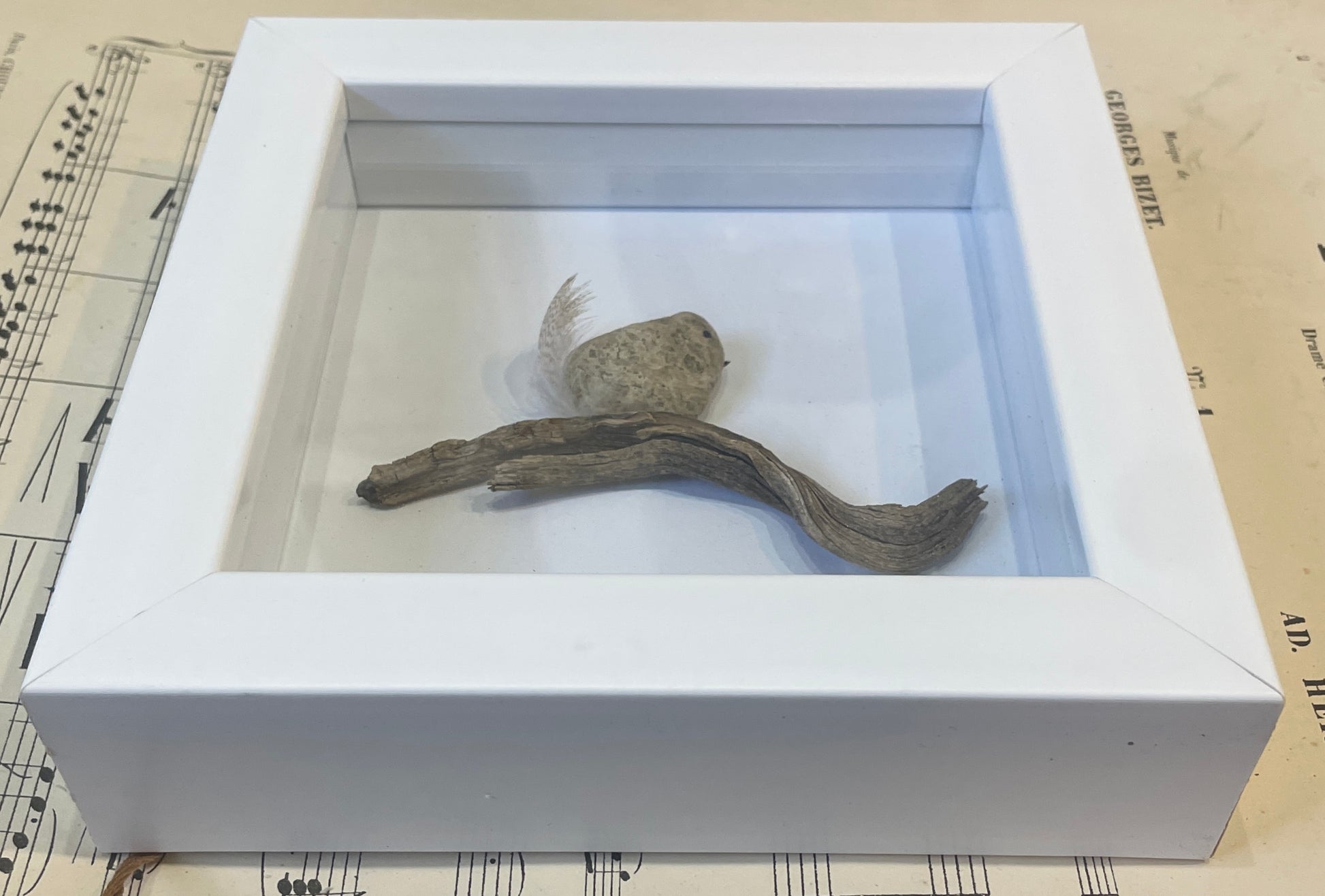 Carol Austin is a WA artist who has a knack for finding stones on her walks that demand to be transformed into one of her Rock Flock. She creates one of a kind shadowbox art using found natural elements to create small vignettes of birds and more. She also makes cards and ornaments.