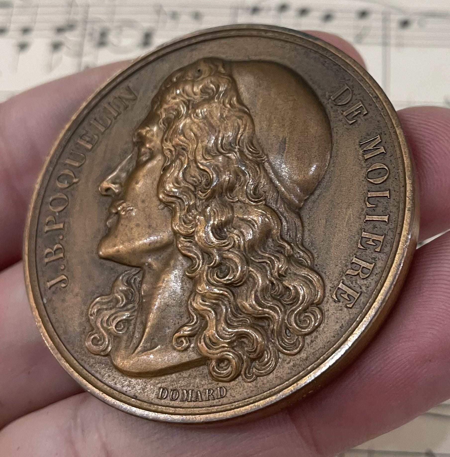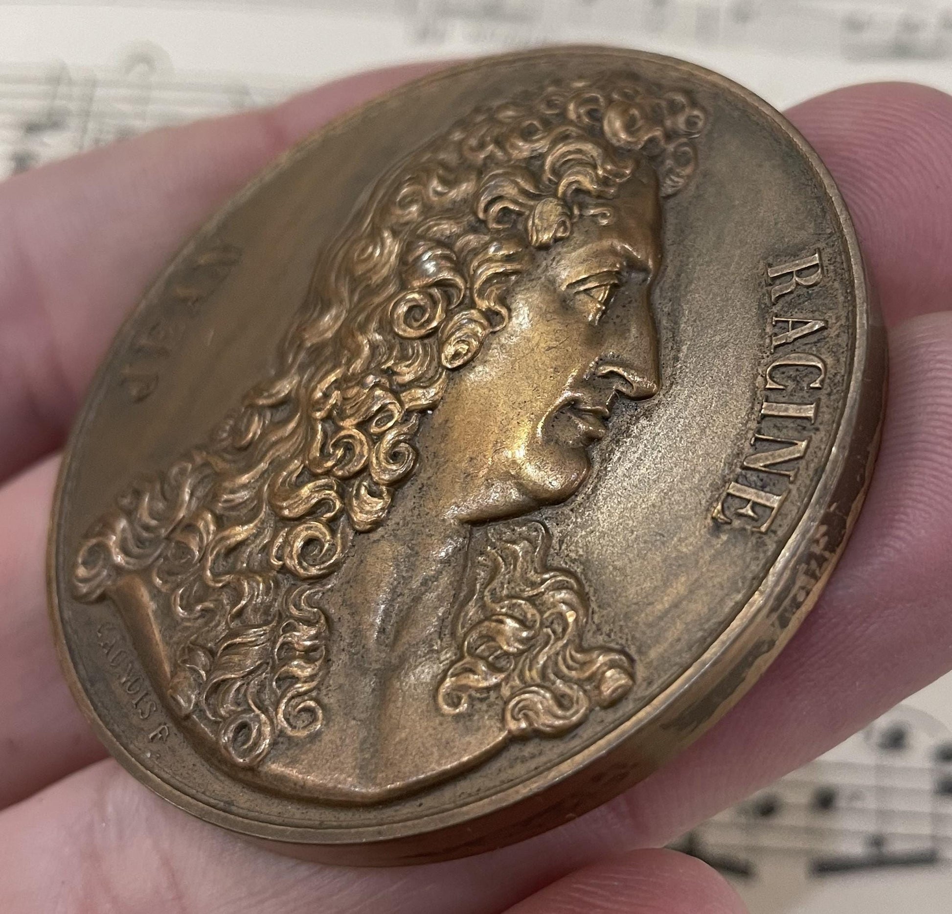 Large Antique French Bronze Jean Racine / Moliere Medal Signed Daumard Caunois c1920. It's in good condition for its age. A true collector piece!