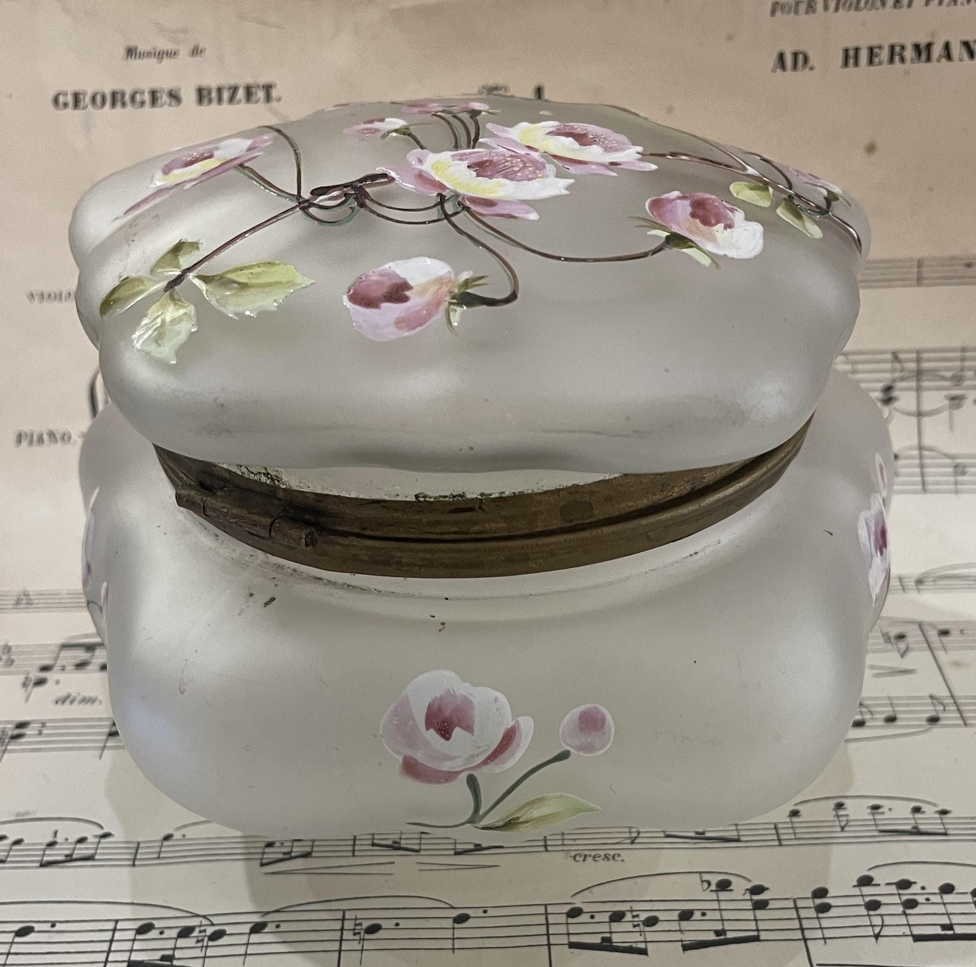 Large Antique French Gilt Brass Glass Hand Painted Enameled Box Flower c1900. It's in good condition for its age.