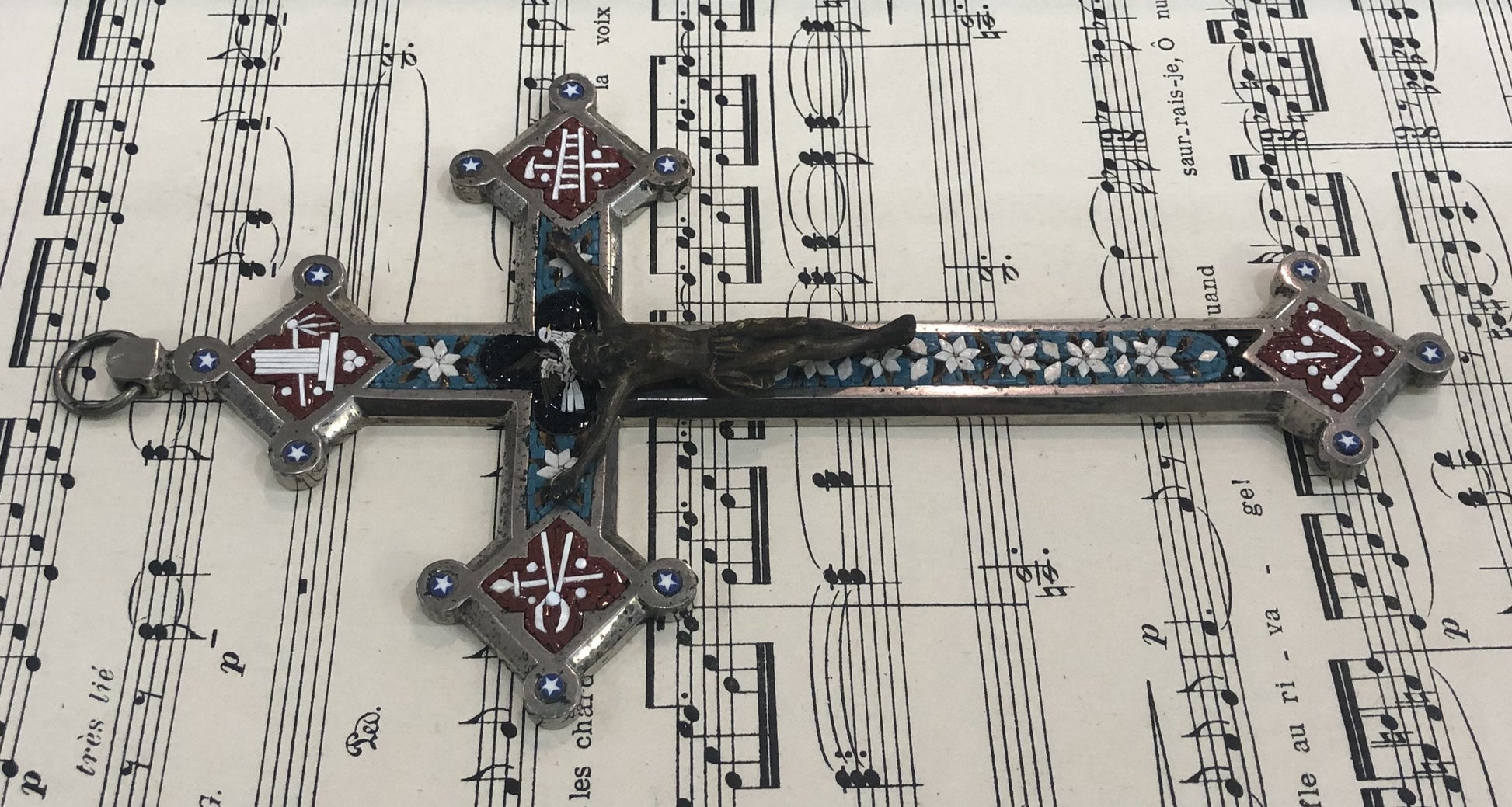 Large Antique Italian Micro Mosaic Micromosaic Cross Crucifix Bird Flowers c1900. It's in good condition. A true collector piece!