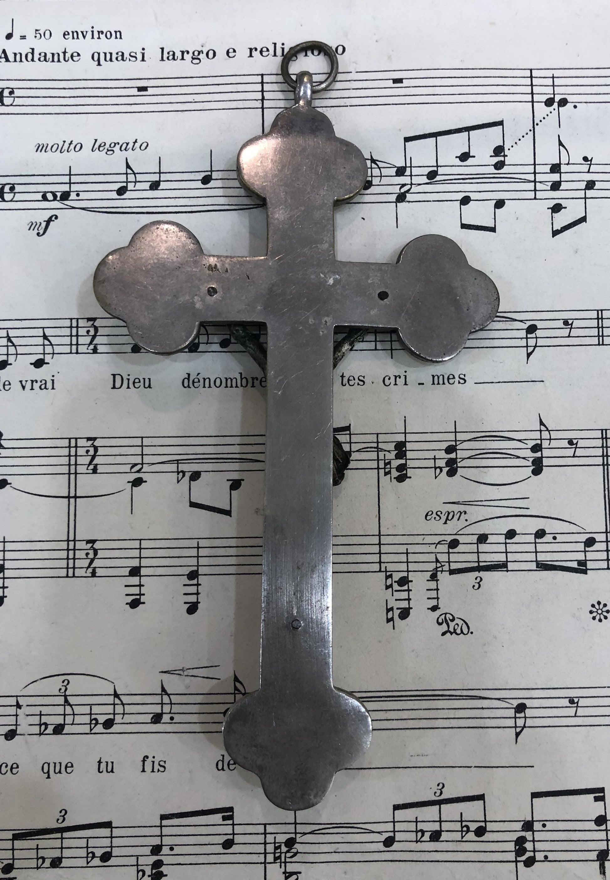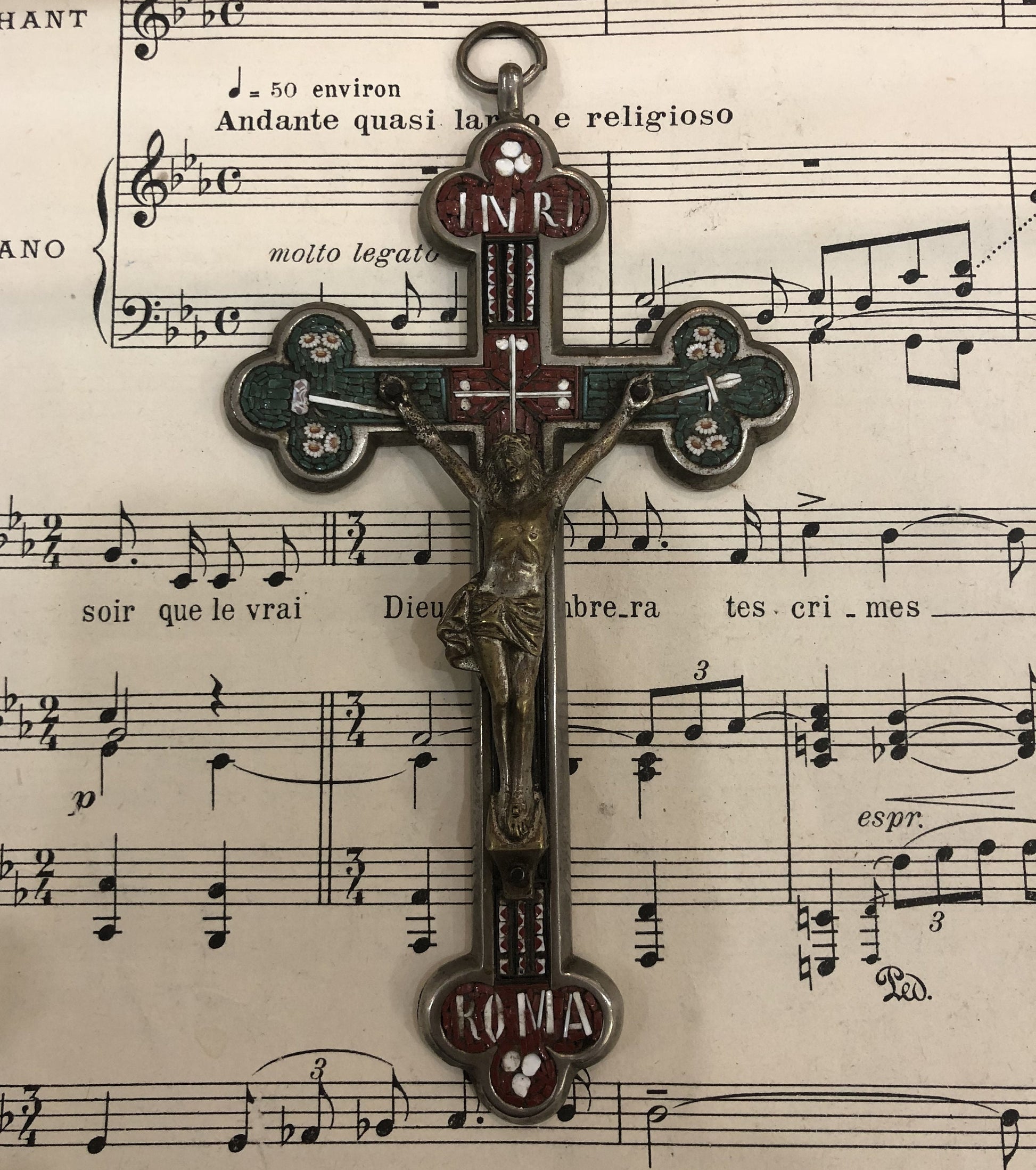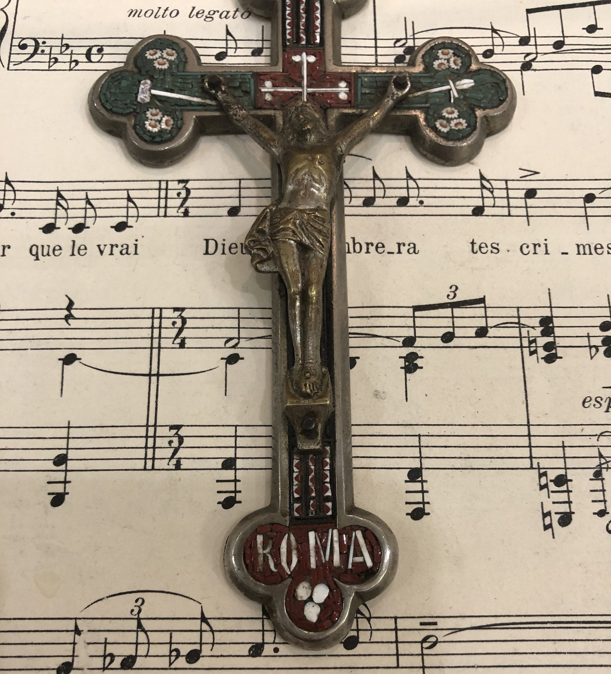 Large Antique Italian Micro Mosaic Micromosaic Cross Crucifix Roma Flowers c1900. It's in good condition.