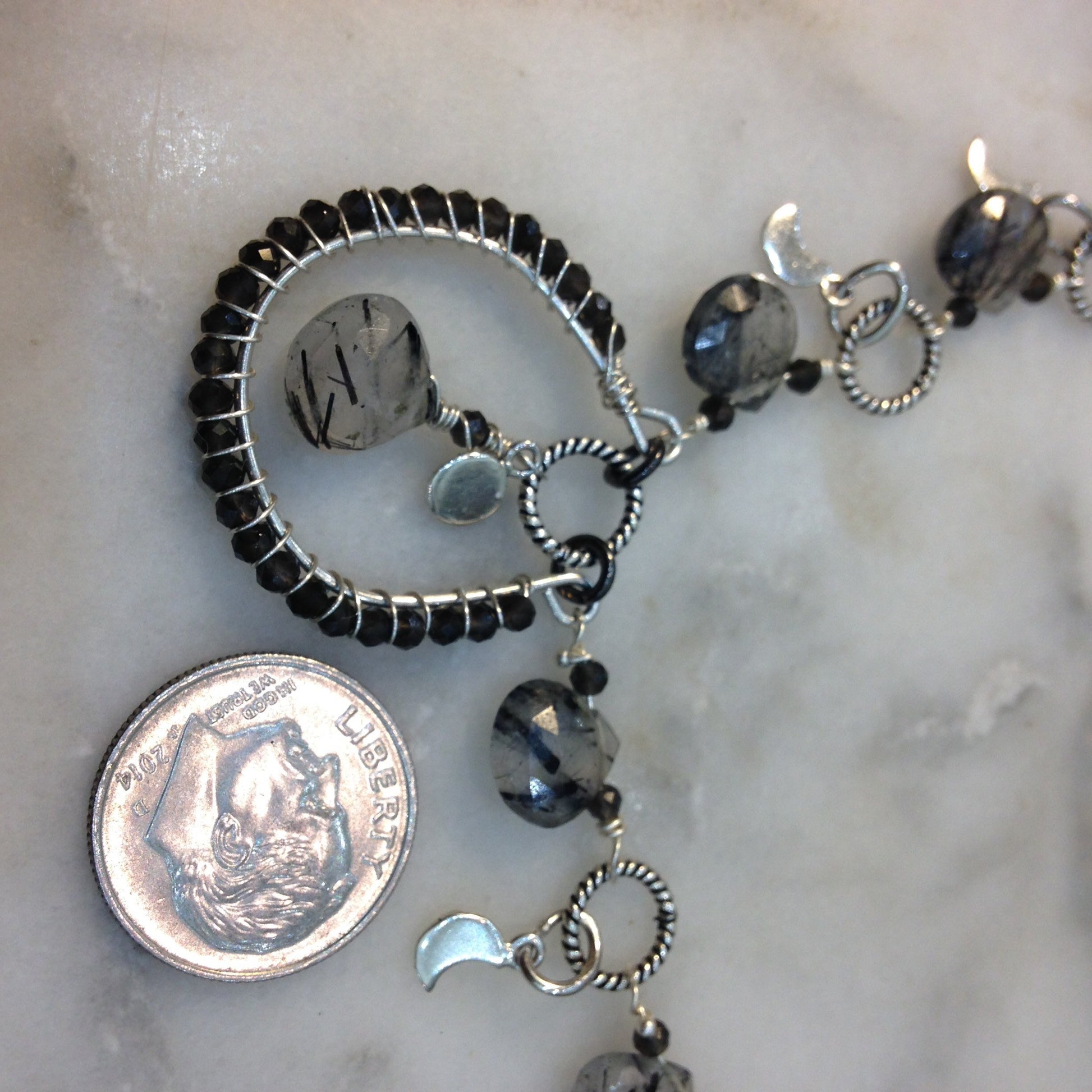 The moon phase wire wrapped necklace is made with grey micro-faceted moonstones, faceted teardrop black tourmaline rutilated Quartz and all handmade sterling silver findings and moonphase charms.