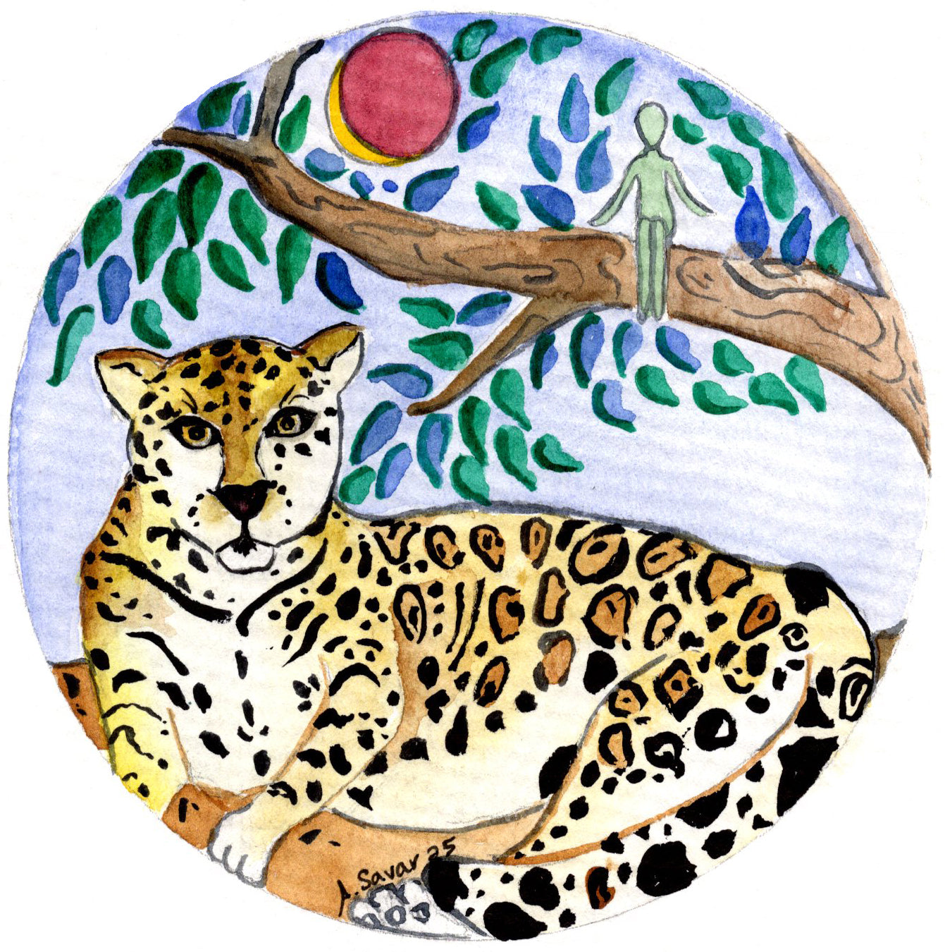 The jaguar painting was painted the night of a blood moon eclipse. The jaguar appeared in the eclipse light where the leaves turned blue and little spirits lingered nearby. It is a miniature.