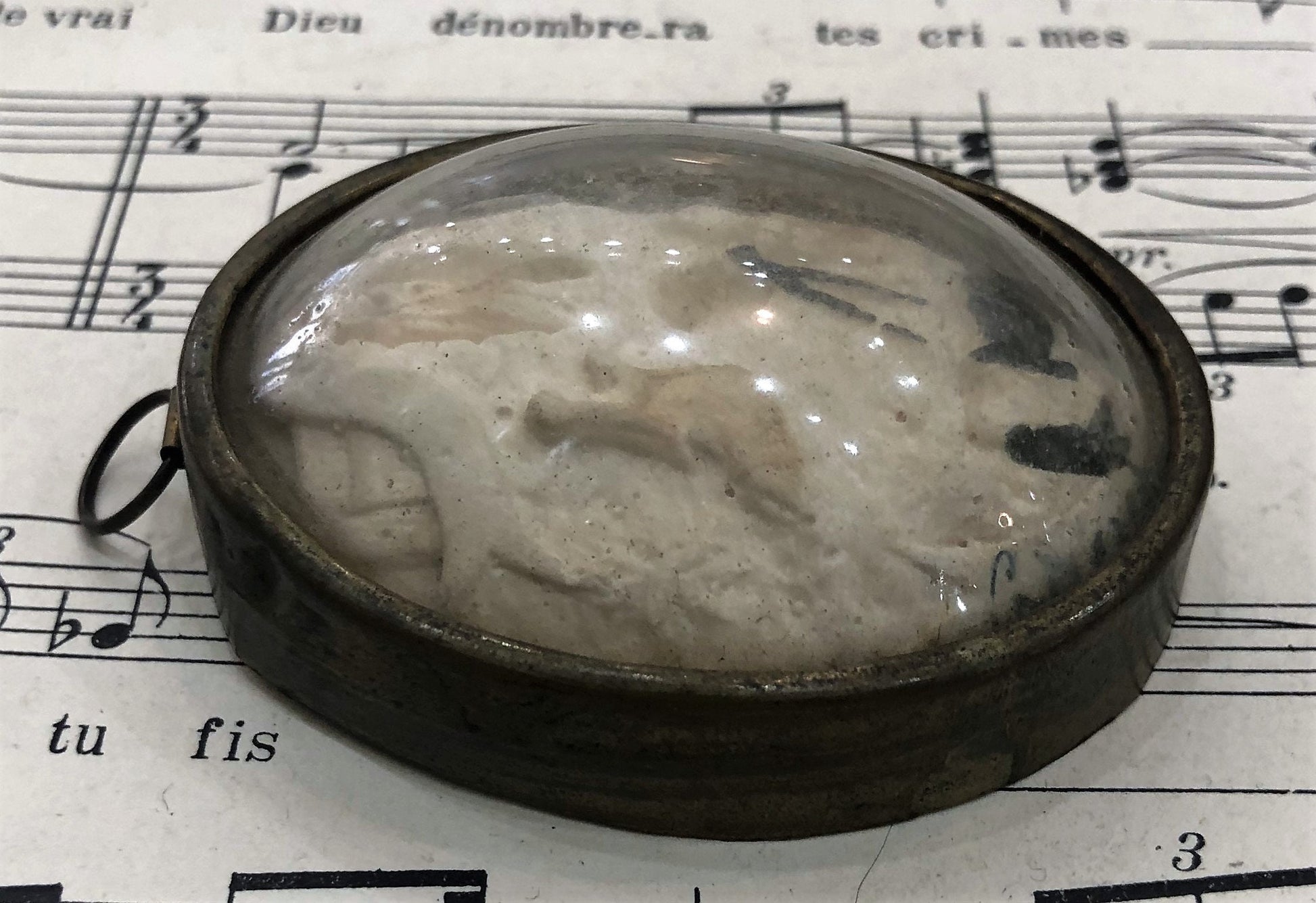 Antique French Carved Plaster Lourdes Miracles St Bernadette Domed Glass Icon c1900. It's in good condition.