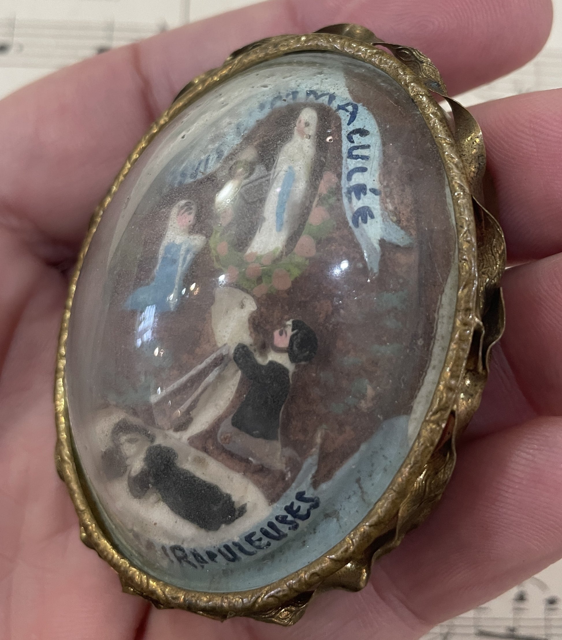 Rare Antique French Carved Plaster Lourdes Miracles St Bernadette Domed Glass Icon c1900