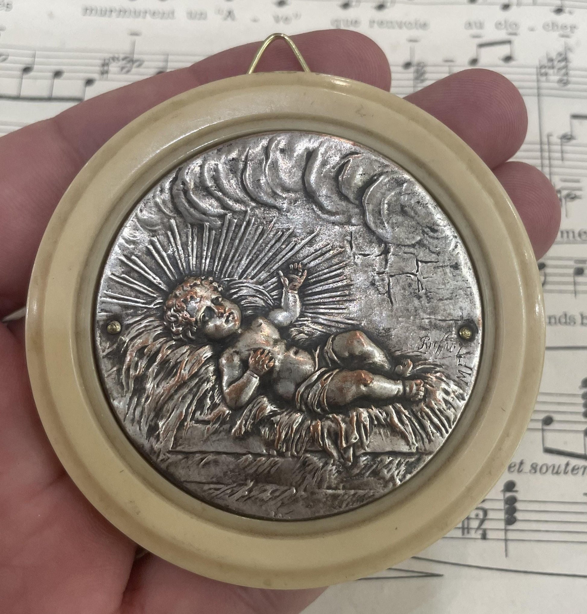 Rare Antique French Crib Cradle Protector Baby Celluloid Baptism Signed Ruffony c1920. It's in good condition for its age.