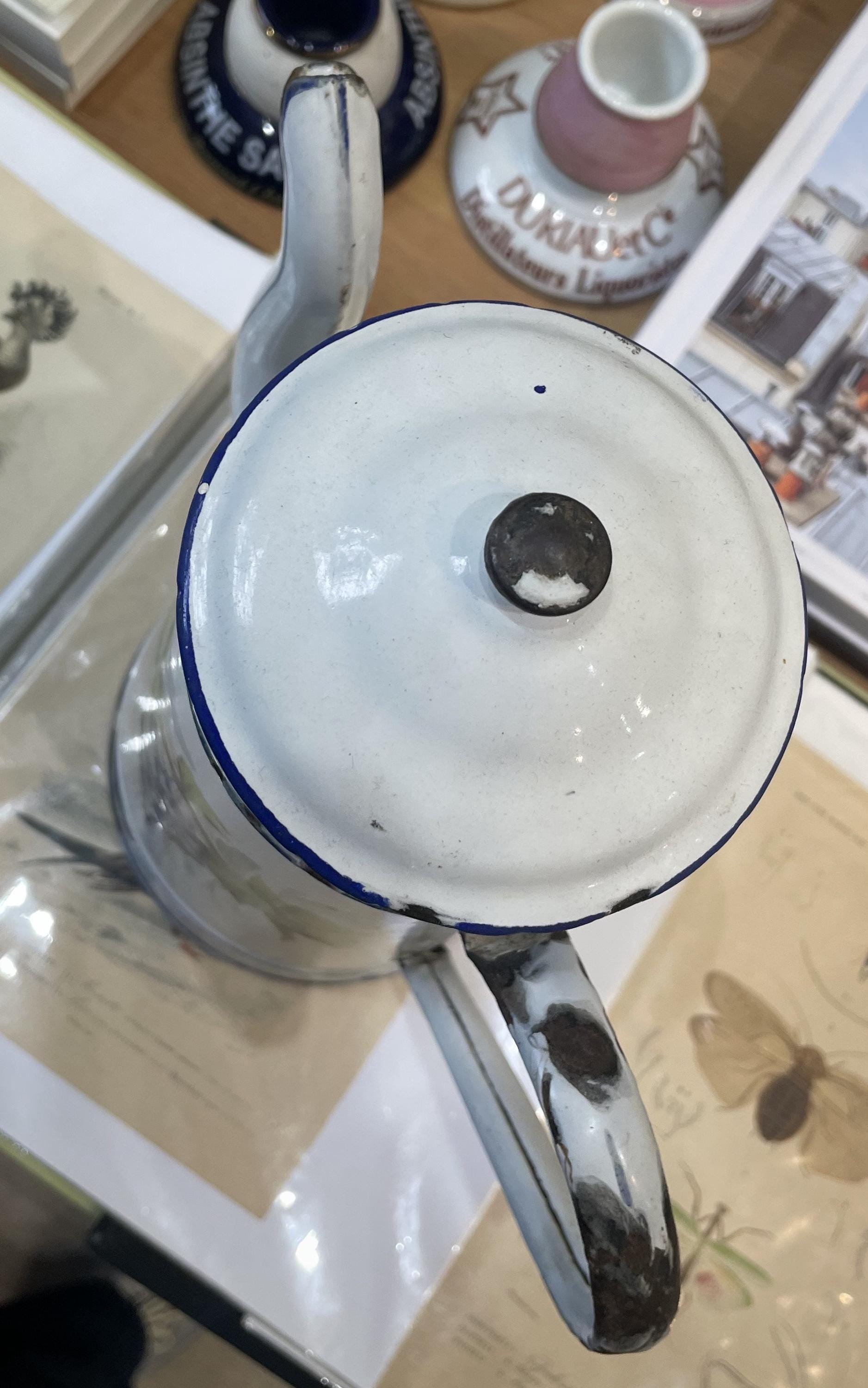 Rare Antique French Enamelware Coffee Pot Grapes Vine c1920. It's almost complete. A few chips on the enamel and a little bit of rust (see photos). Overall in good condition for its age.