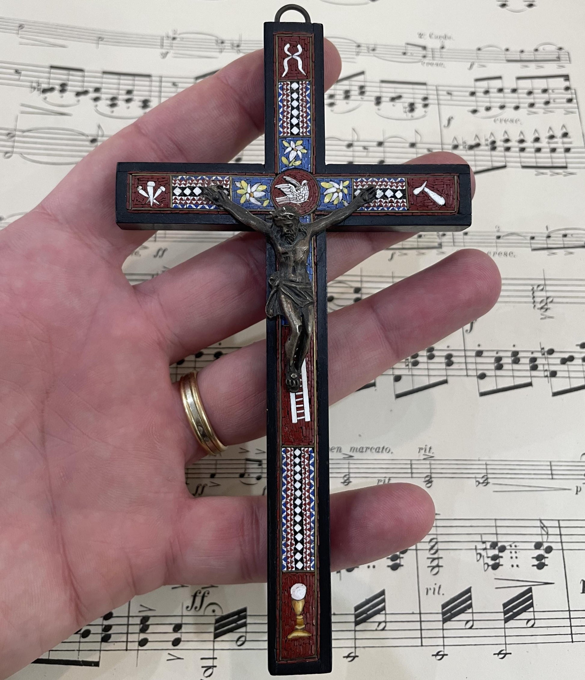 Rare Antique Italian Micro Mosaic Micromosaic Cross Crucifix Bird Set in Wood c1900. It's in good condition. A true collector piece!