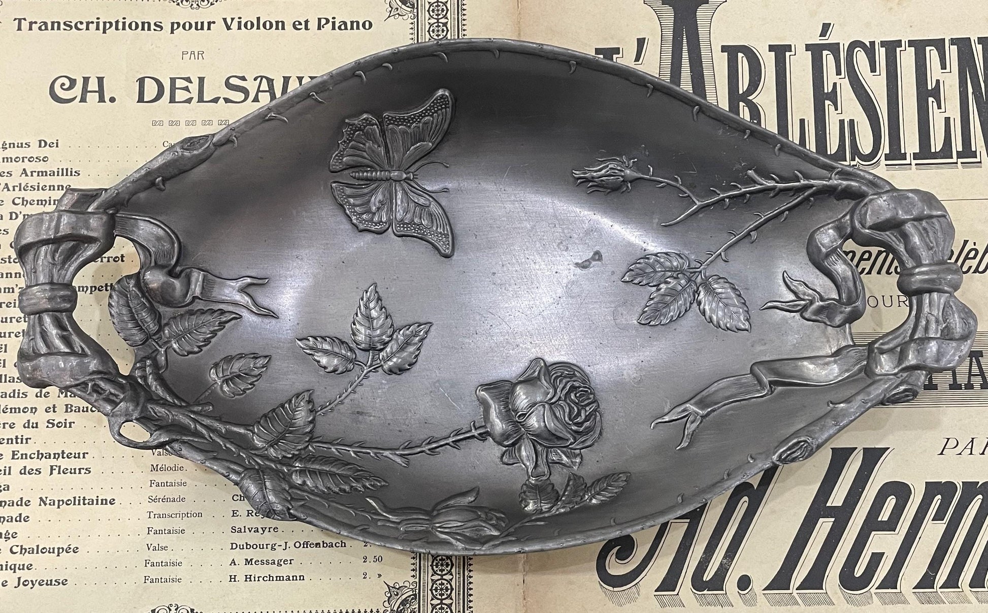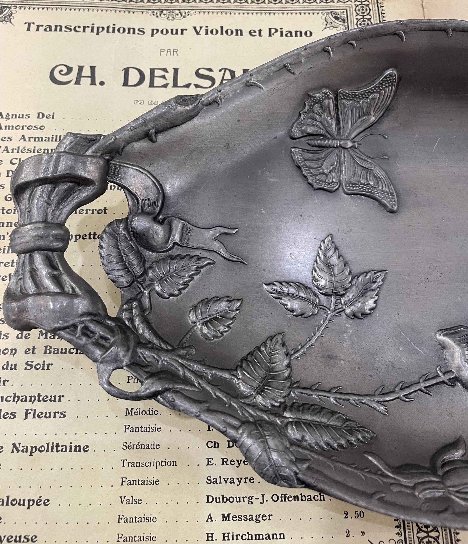 Rare Large Antique French Art Nouveau Pewter Tray Butterfly Roses c1920