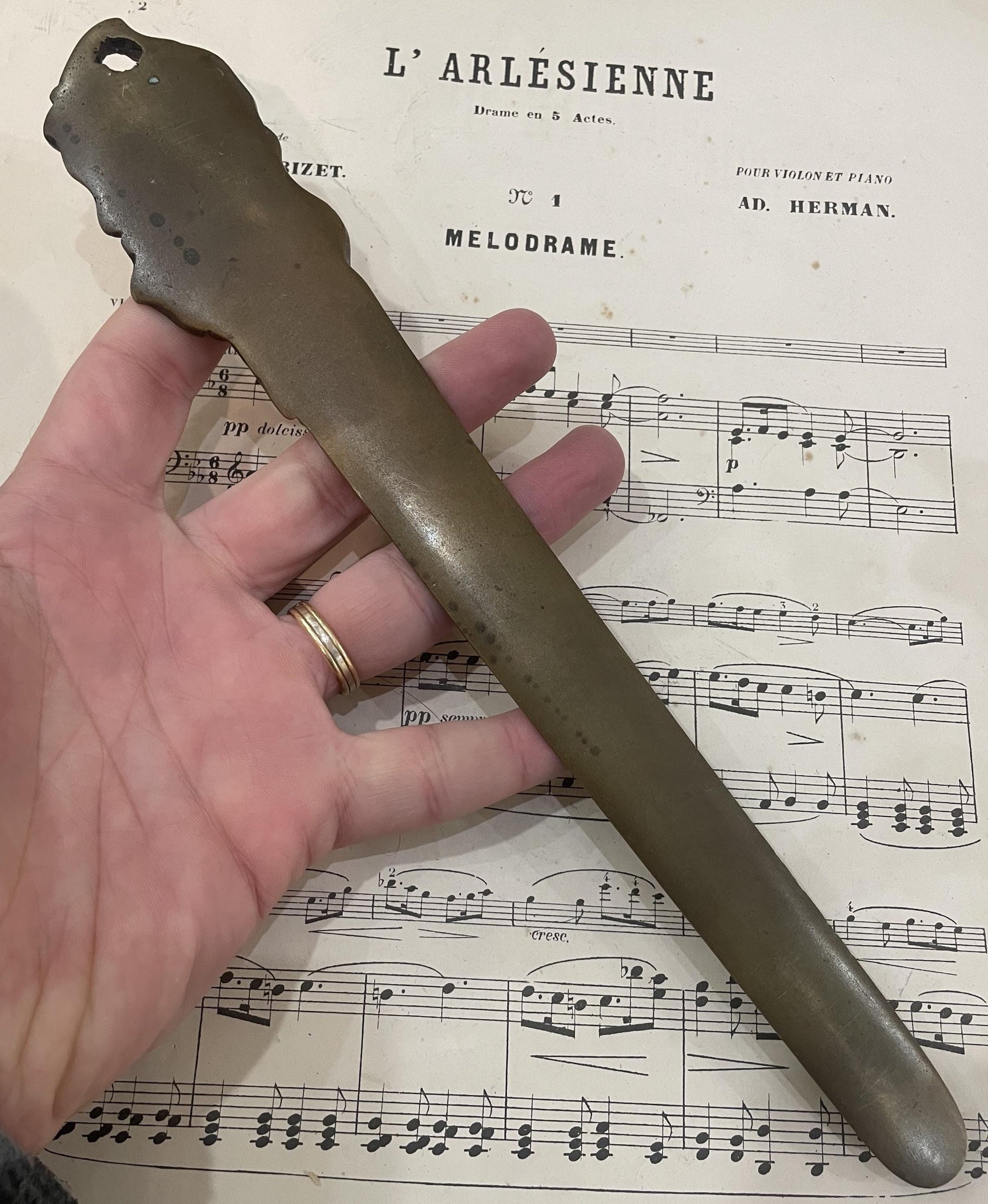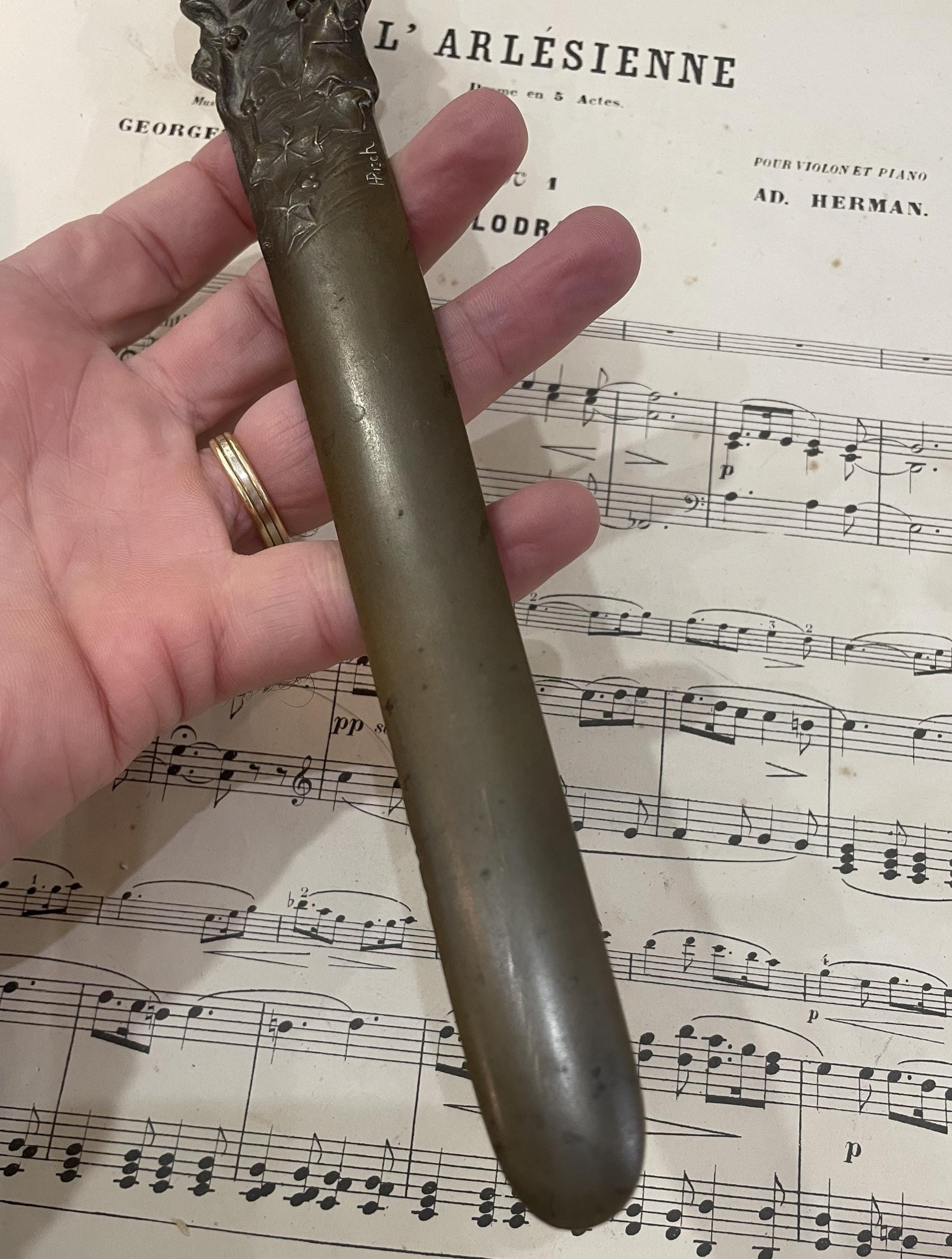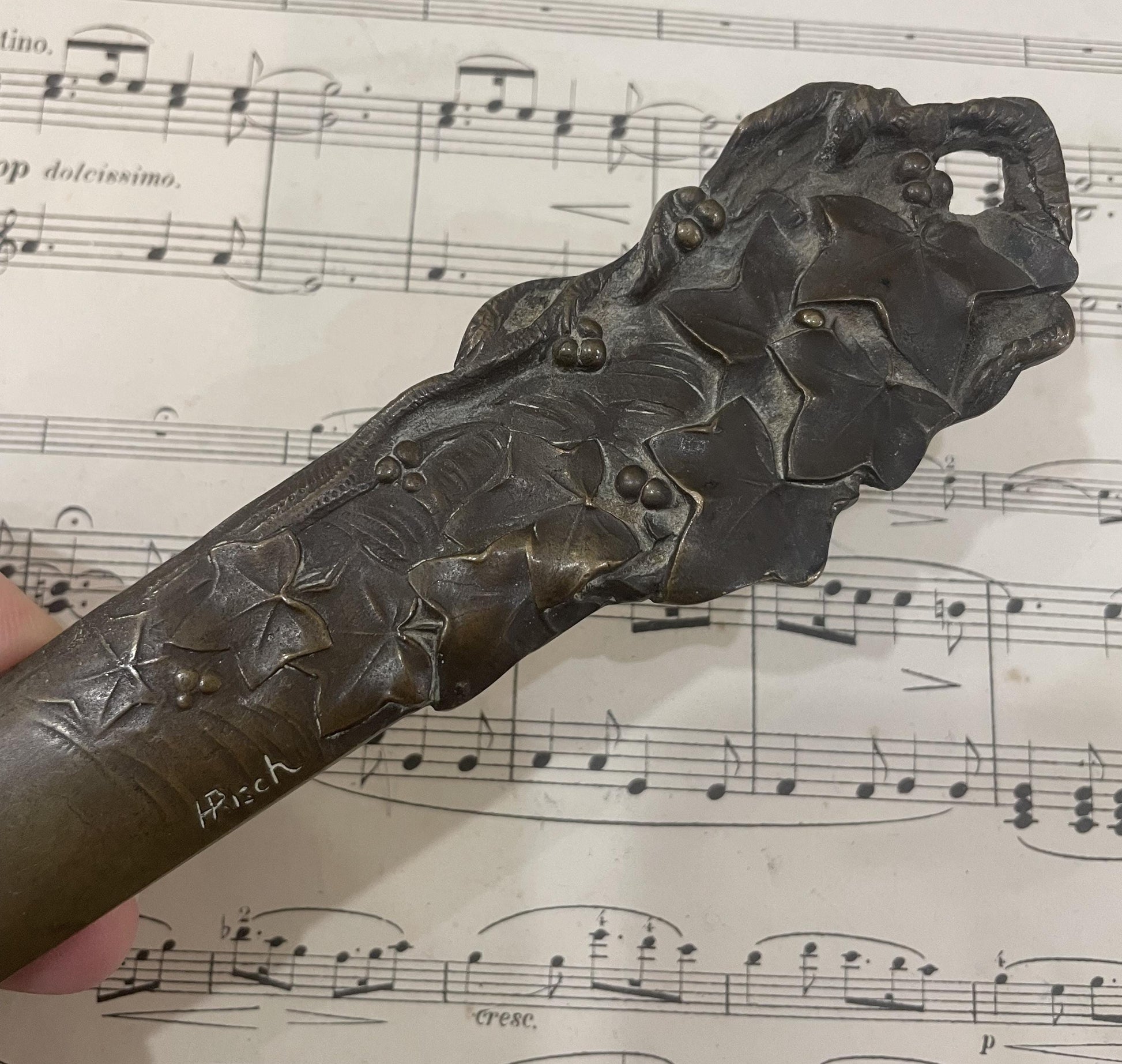 Rare Large Antique French Bronze Art Nouveau Letter Opener Leaves Signed Risch c1880. It's in good condition.