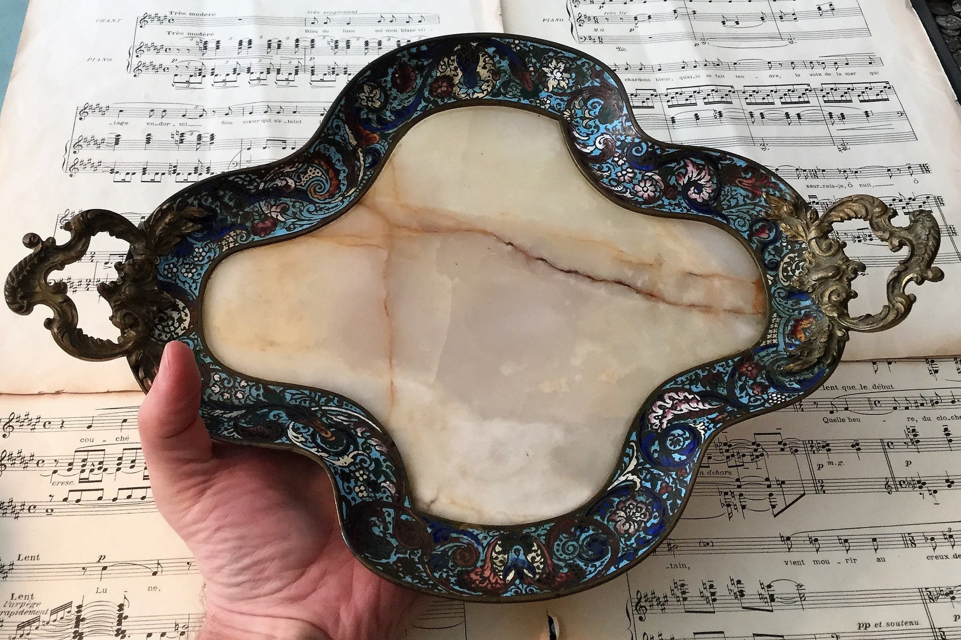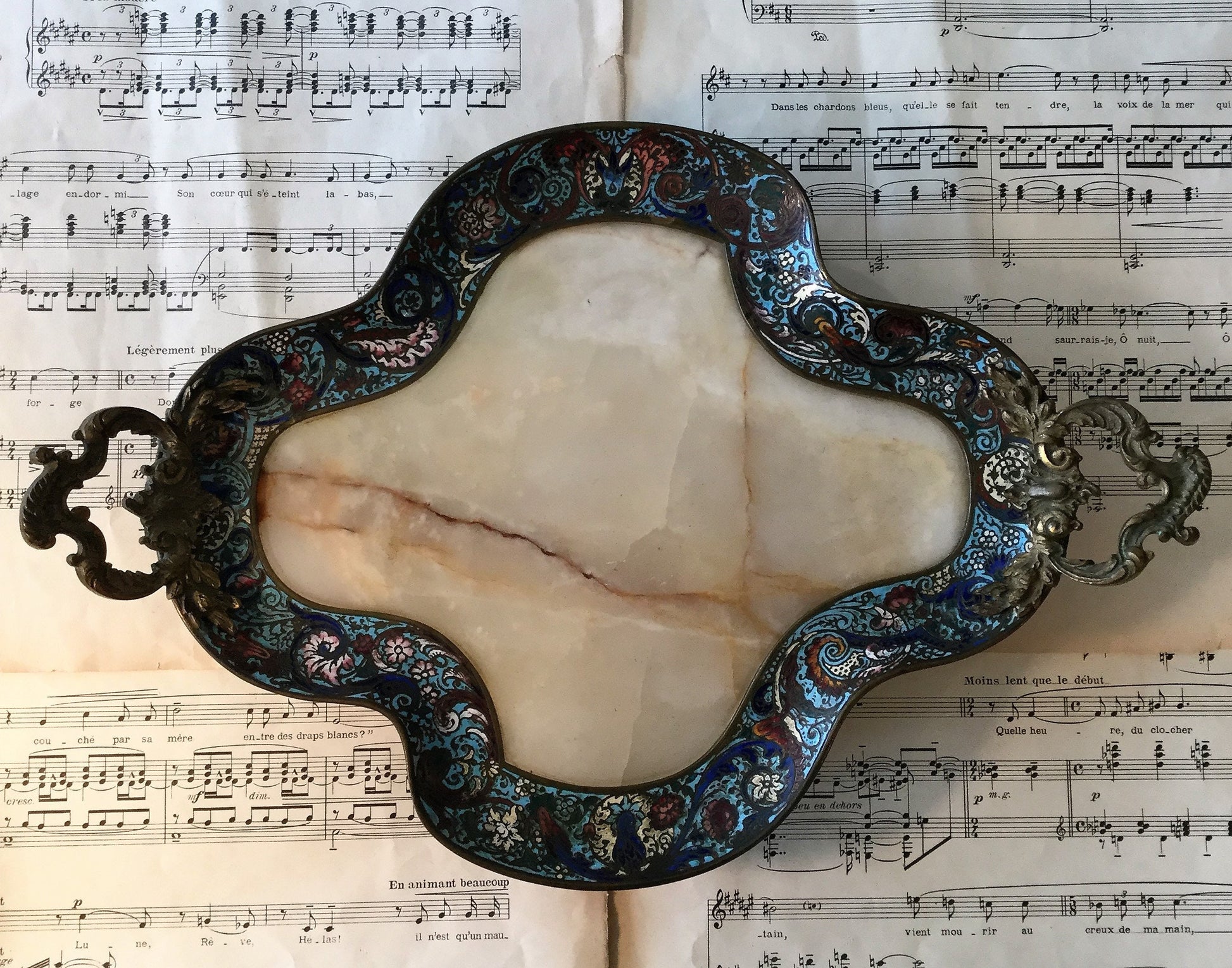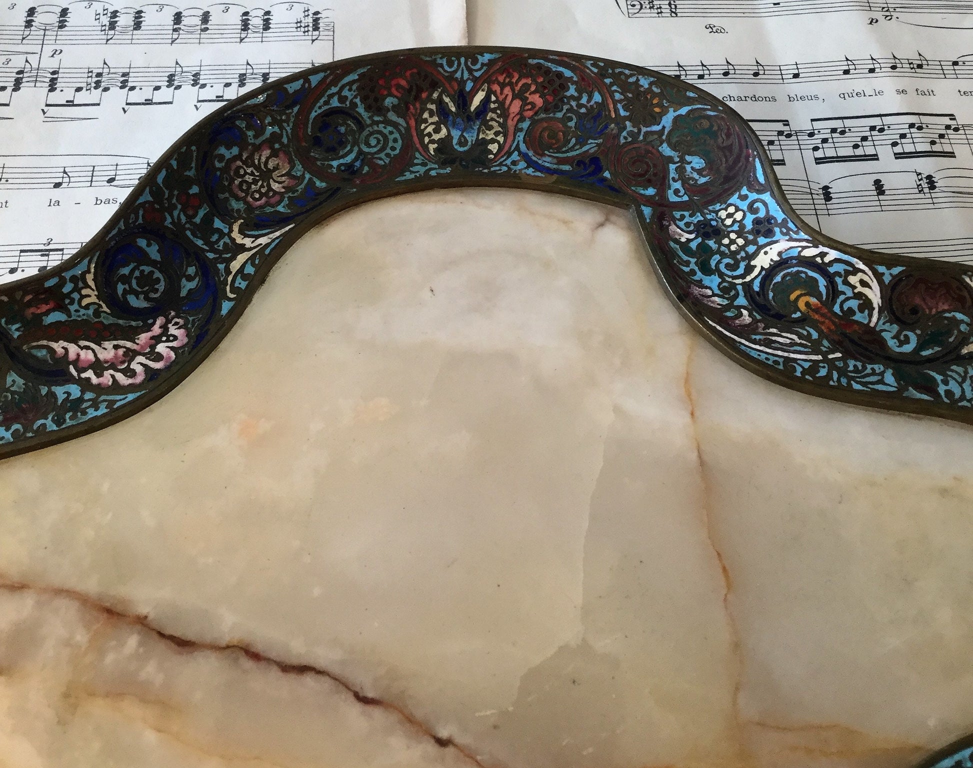 Rare Large Antique French Bronze Champleve Enamel Onyx Tray Platter Centerpiece c1880. The onyx plaque is in good condition (the darker lines are just the veins). There are no enamel loss. Overall in great condition for its age. A rare and beautiful piece!