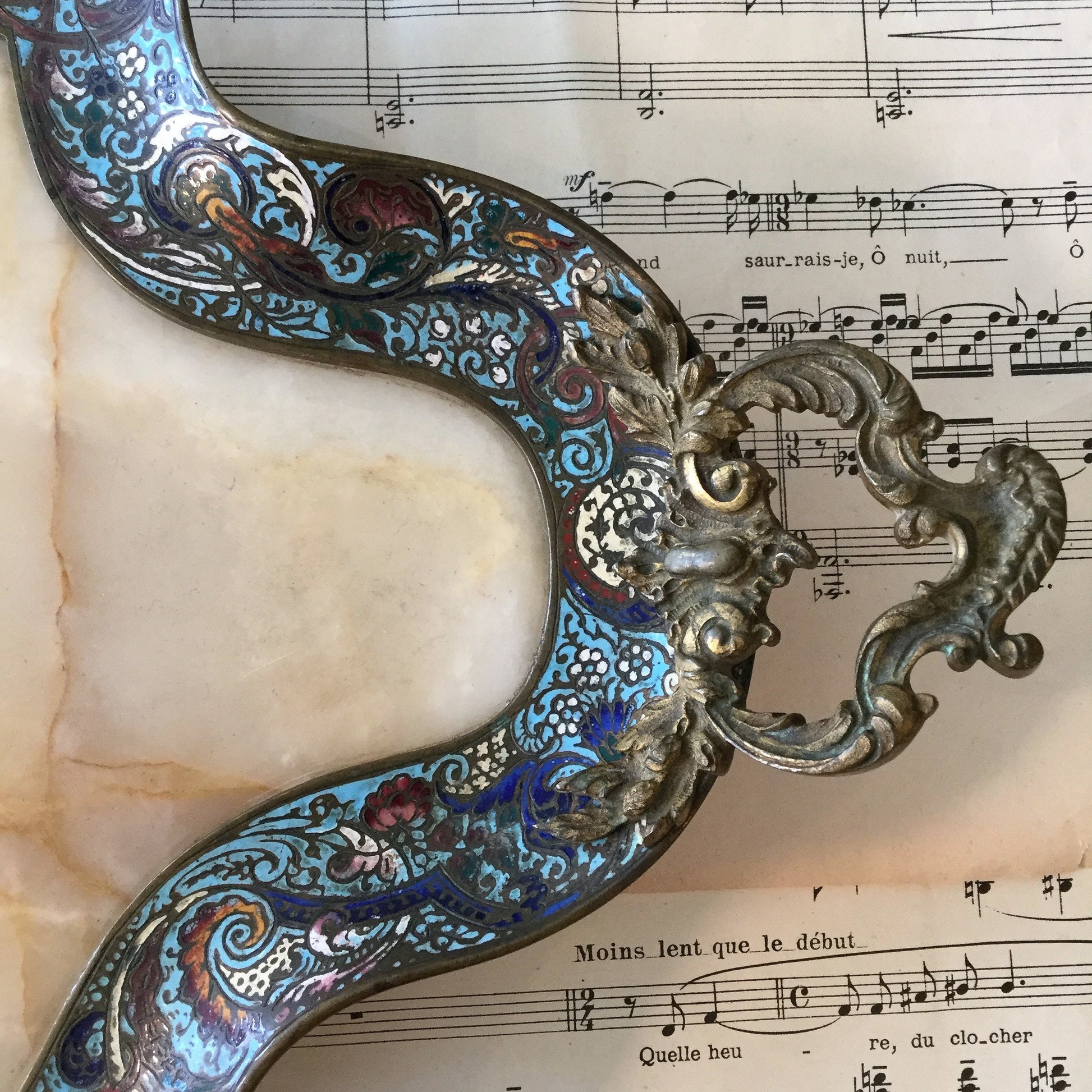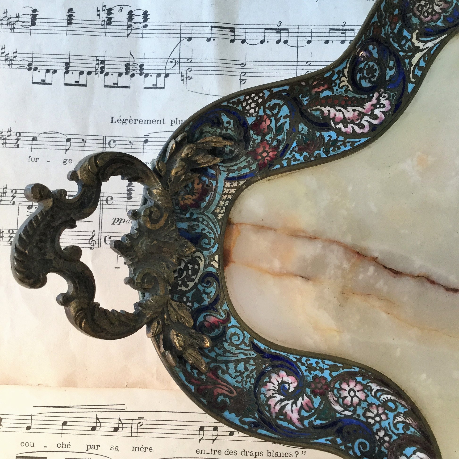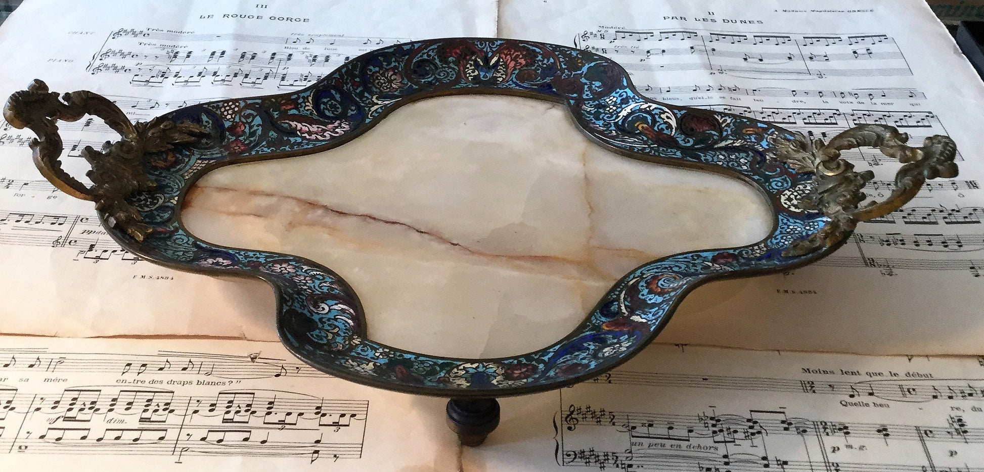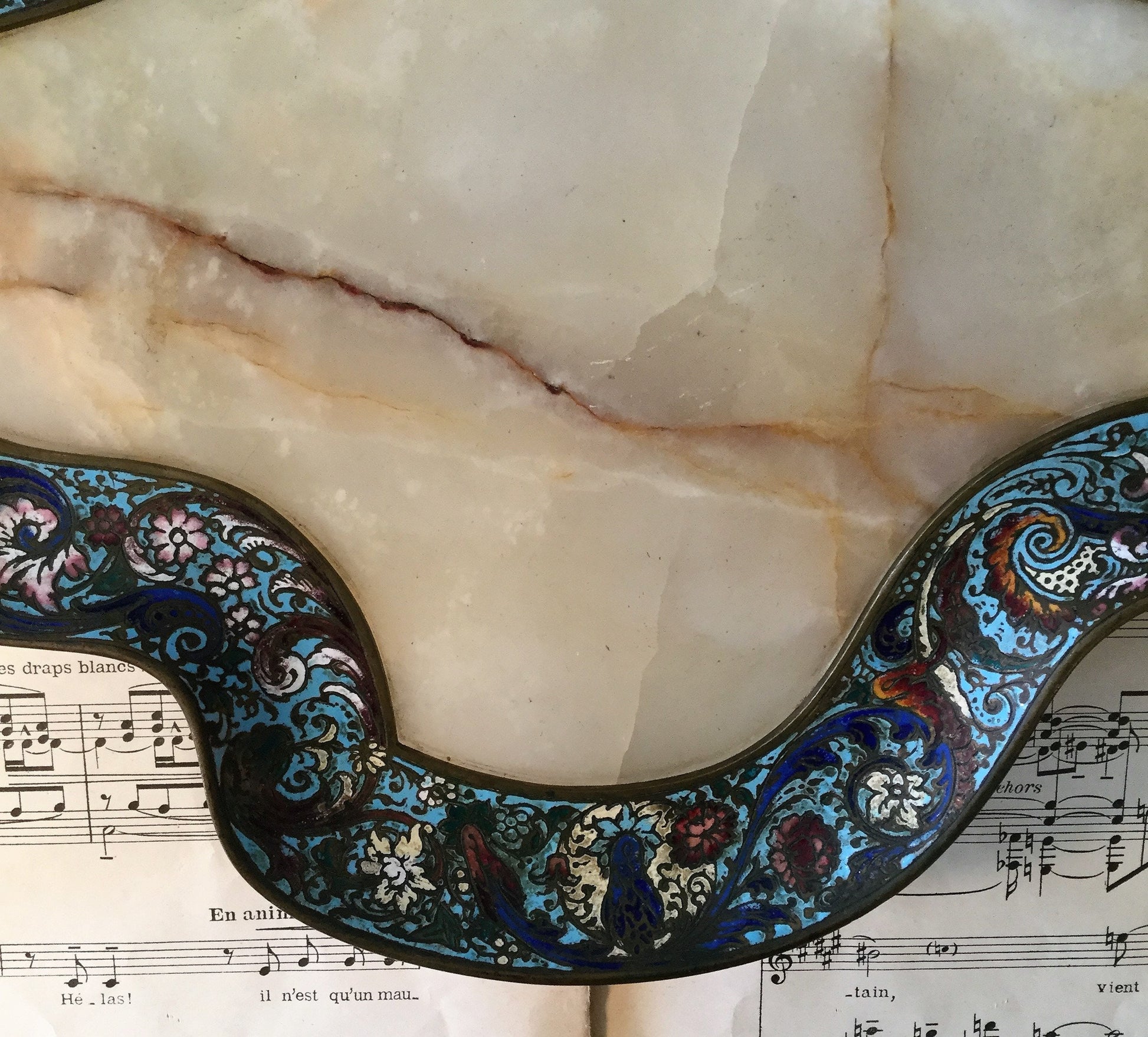 Rare Large Antique French Bronze Champleve Enamel Onyx Tray Platter Centerpiece c1880. The onyx plaque is in good condition (the darker lines are just the veins). There are no enamel loss. Overall in great condition for its age. A rare and beautiful piece!