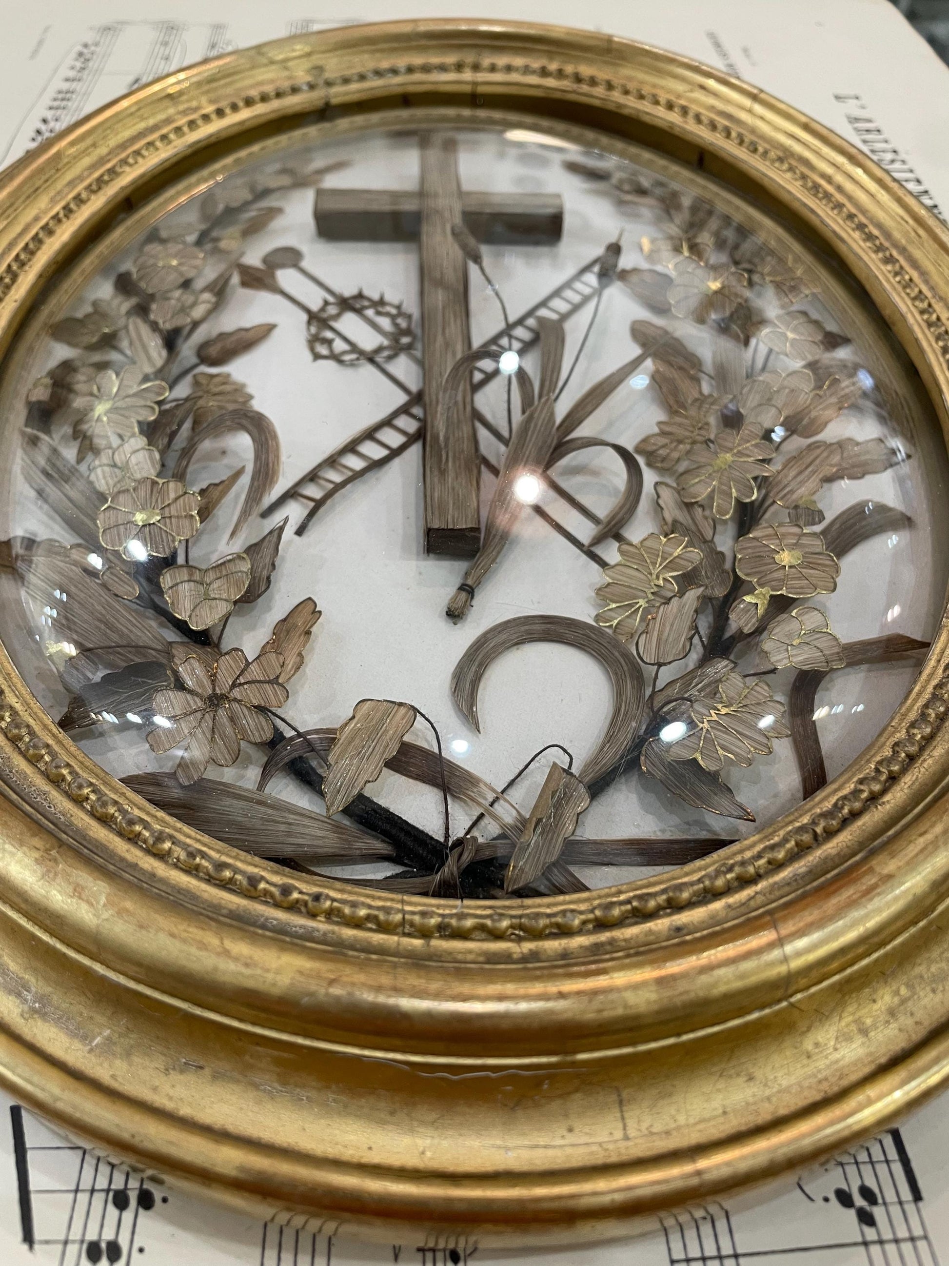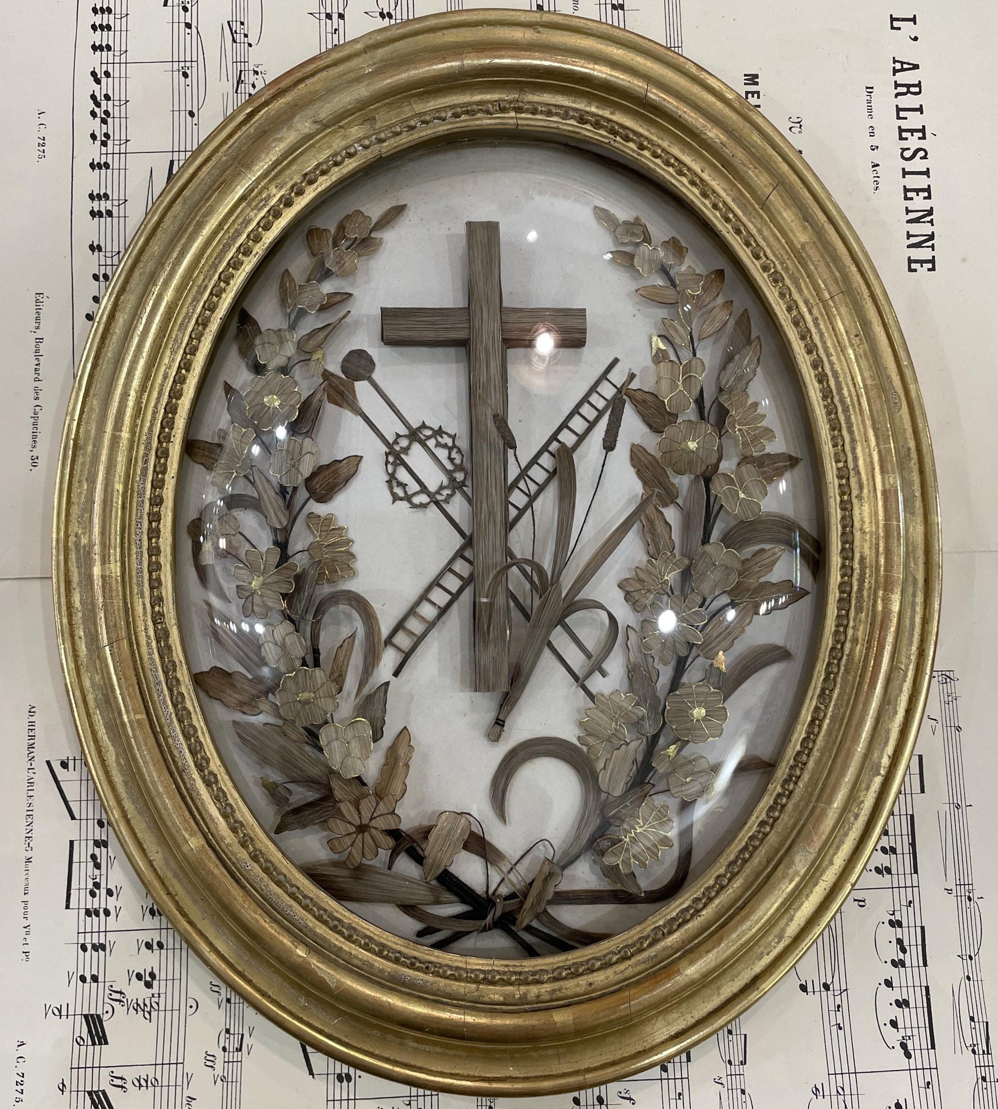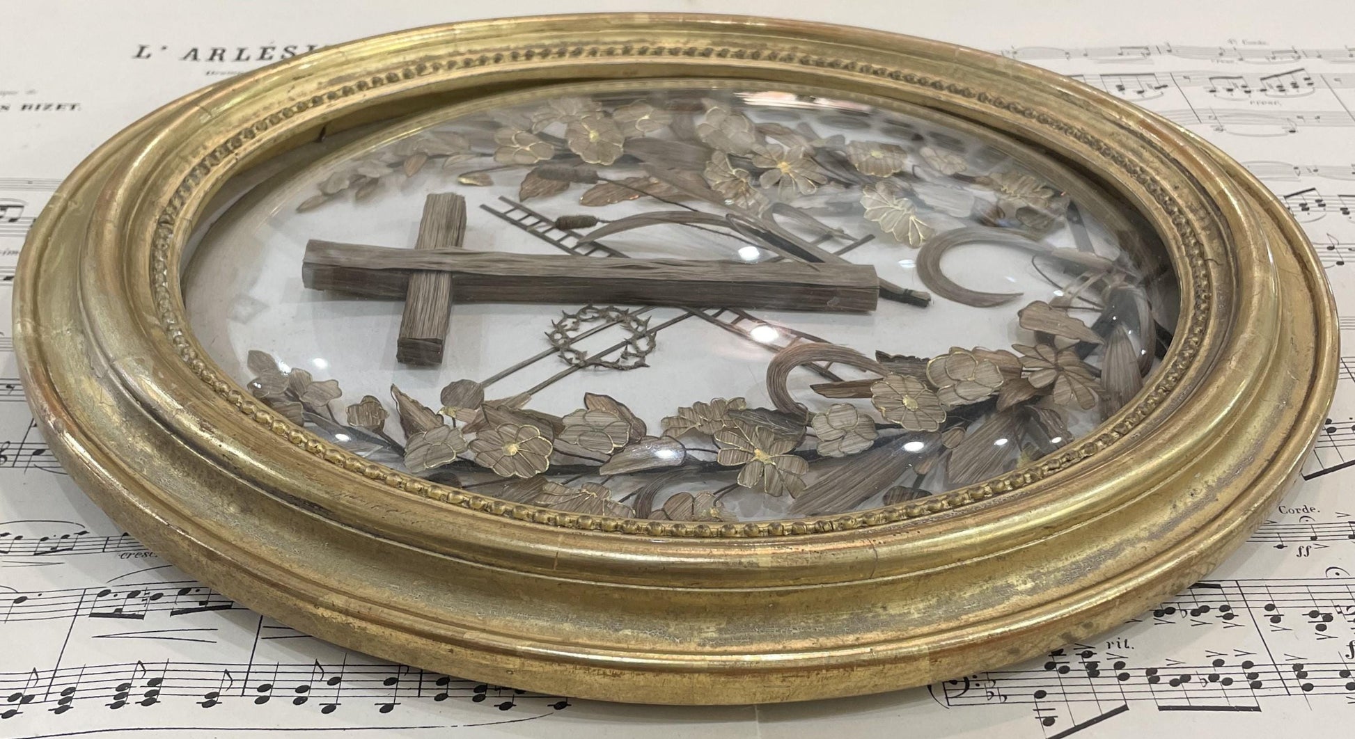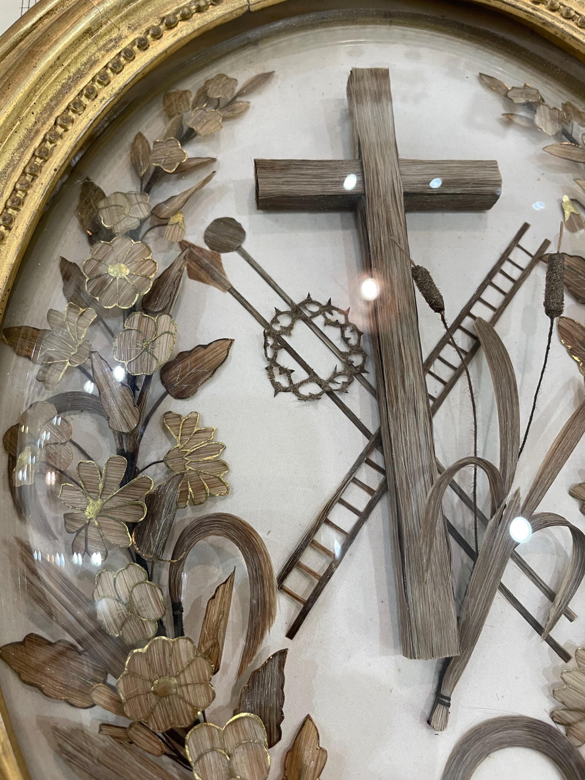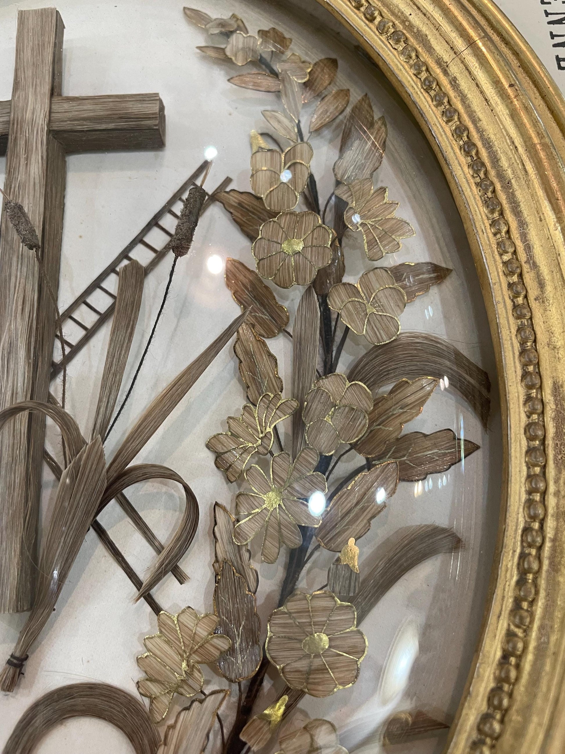 Rare Large Antique French Mourning Hair Art Domed Glass Oval Wooden Frame c1880. Rare in that size with the gold paint on the frame and on the leaves and flowers made with hair inside. The glass is moving a little but it's totally fine once on the wall. It's in good condition.