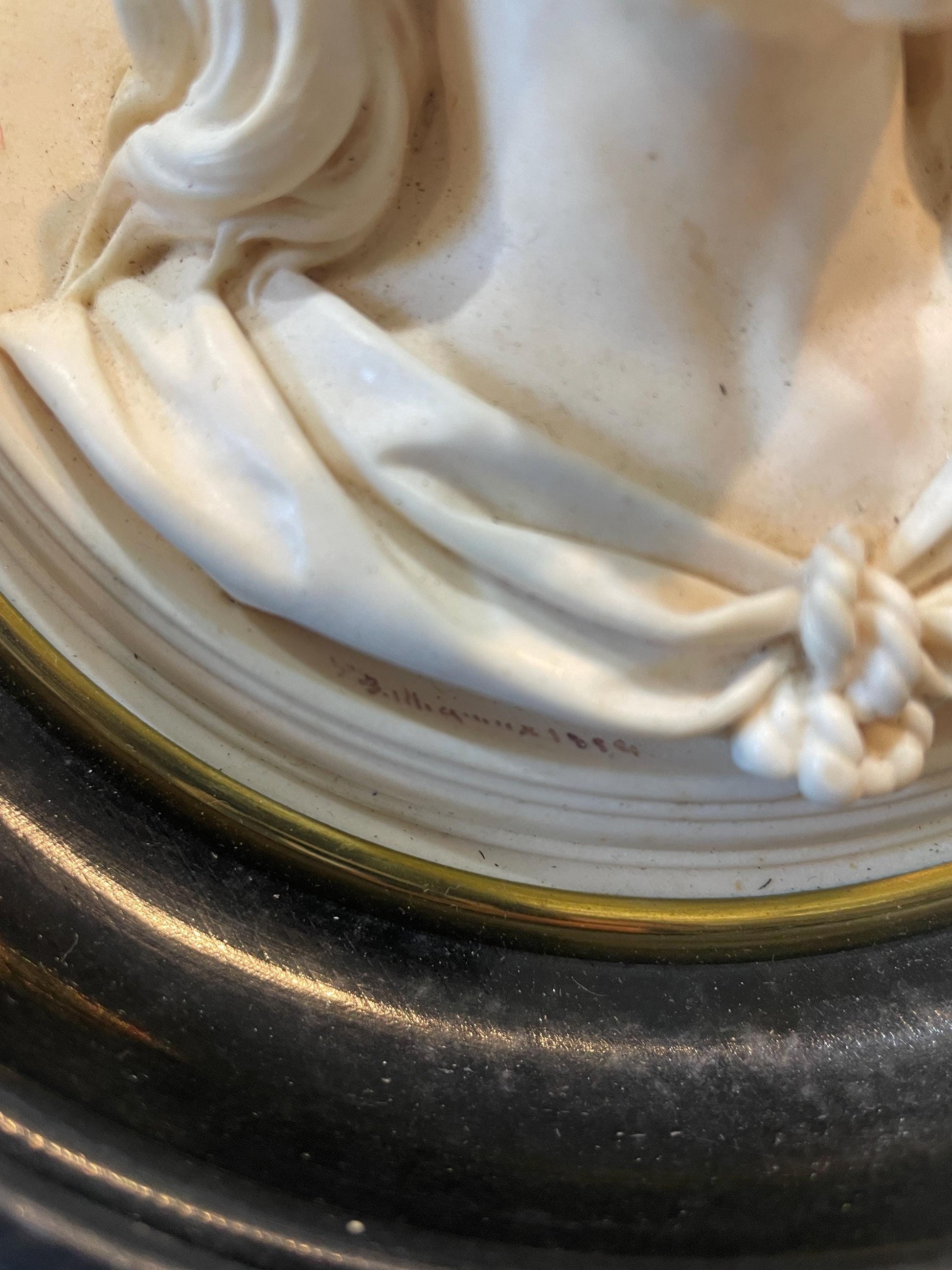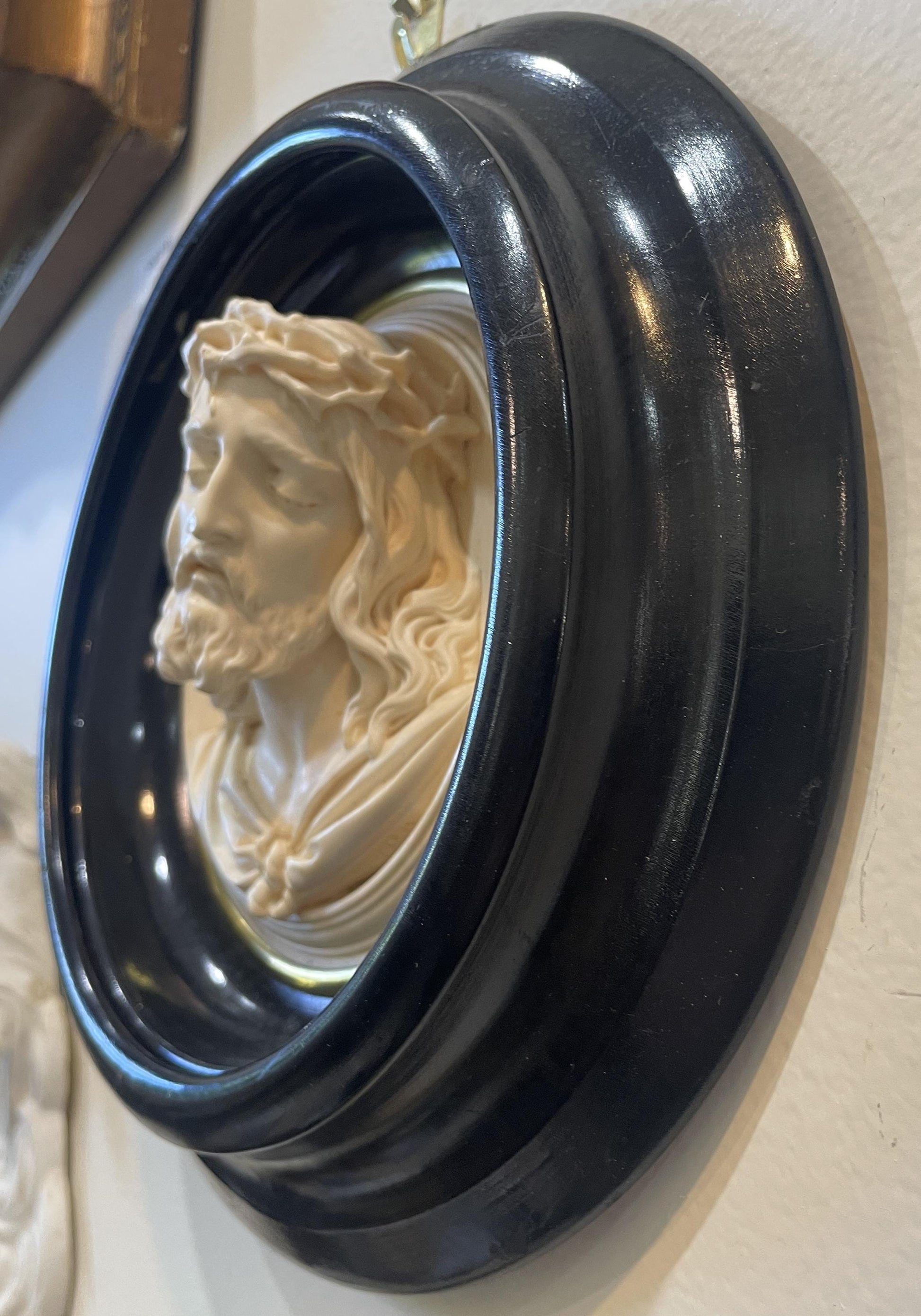 Rare Large French Antique Carved Plaster Jesus Signed Wall Icon c1854. It's signed and dated on the plaster on the bottom below the bust. The frame has a couple dents and scratches (see photos). Overall in good condition for its age. A true collector's piece!