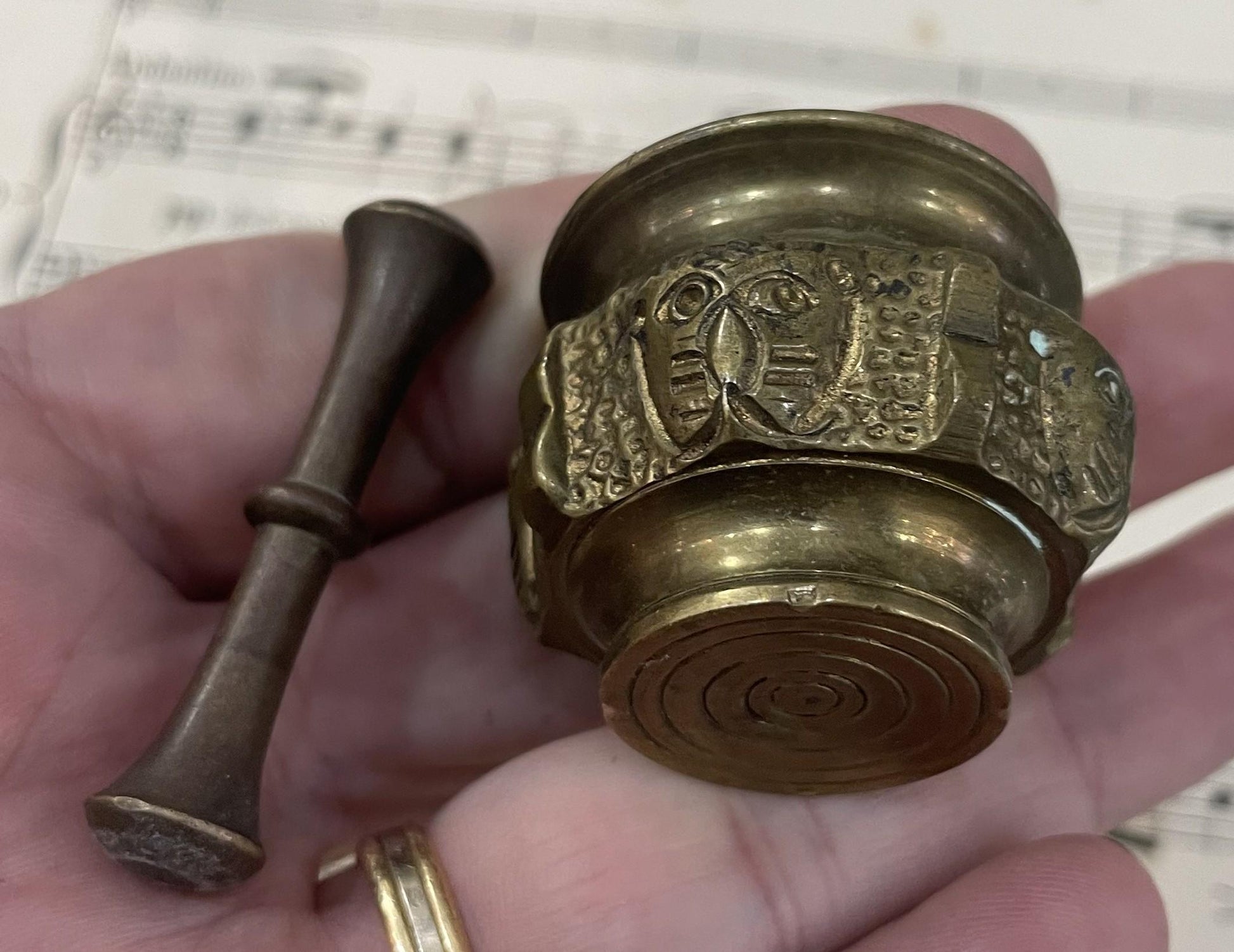 Rare Small Antique French Bronze Mortar and Pestle Apothecary Lion c1900. It's in good condition for its age.