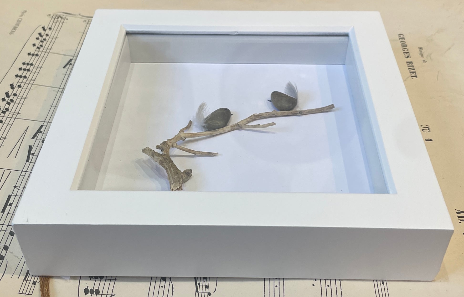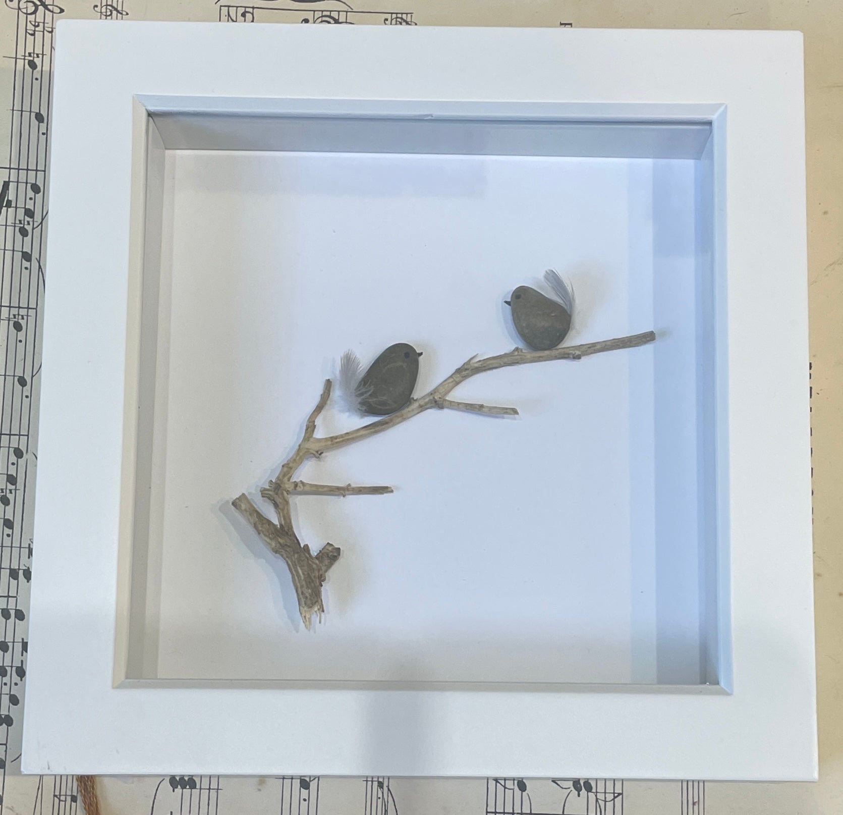 Carol Austin is a WA artist who has a knack for finding stones on her walks that demand to be transformed into one of her Rock Flock. She creates one of a kind shadowbox art using found natural elements to create small vignettes of birds and more. She also makes cards and ornaments.