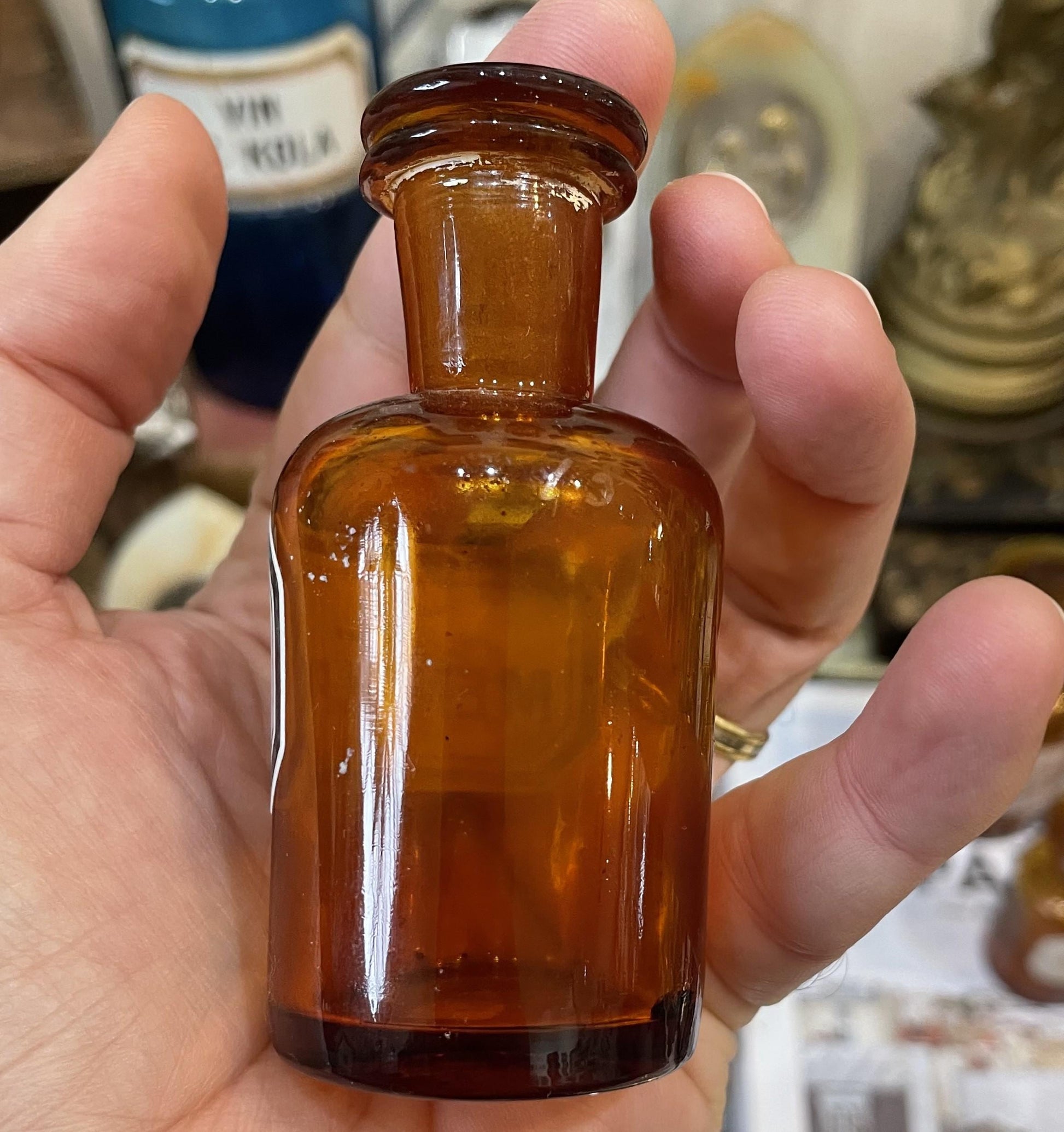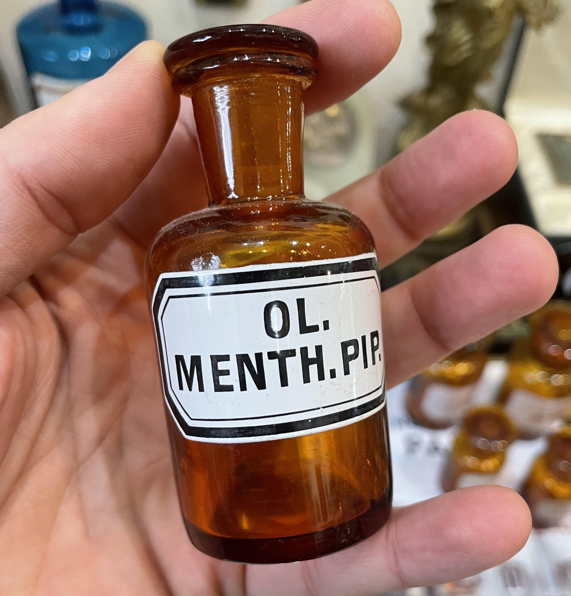 Small Antique French Apothecary Bottle Amber Glass Ol. Menth. Pip. c1880. It's in good condition for its age.