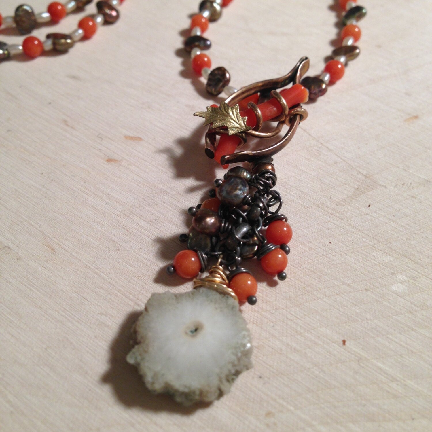 The coral wishbone necklace is made with a 14k gold filled Victorian pendant with tiny leaves and a lucky coral wishbone, vintage Italian coral, freshwater pearls solar quartz with oxidized sterling silver and 14k gold-filled findings.