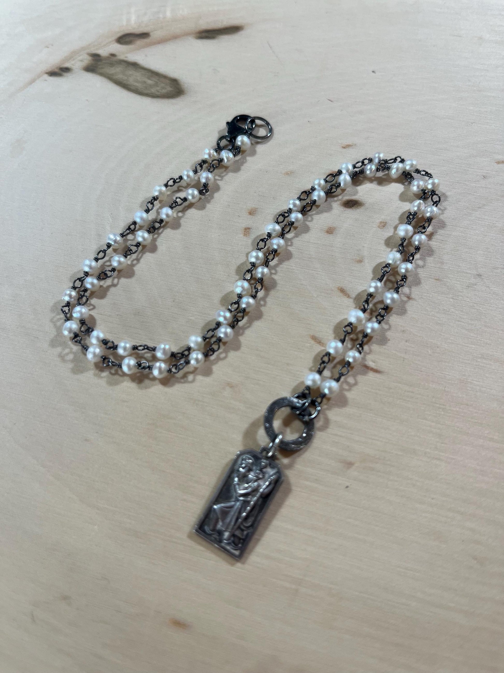 Vintage Sterling St Christopher necklace with pearls and sterling silver components