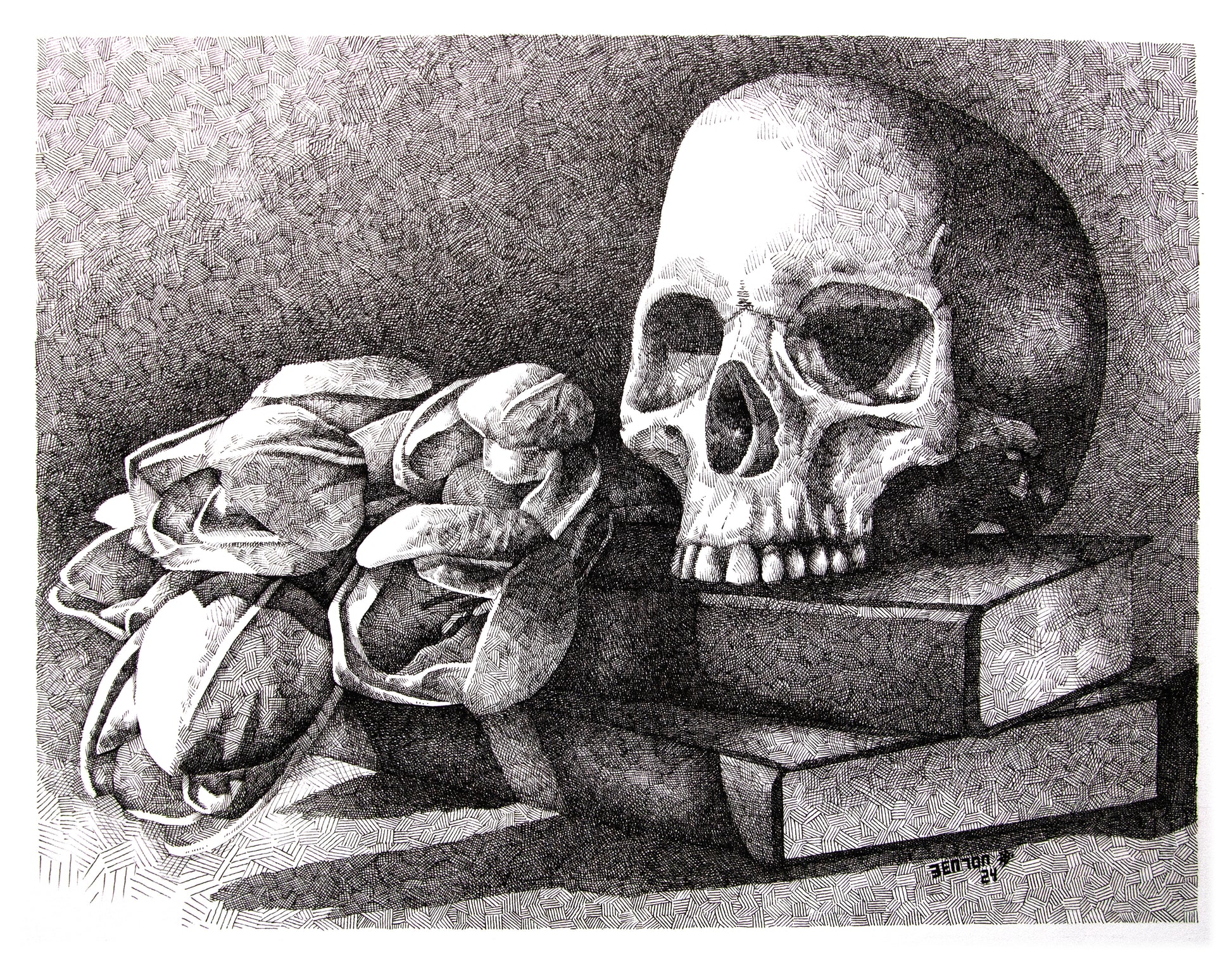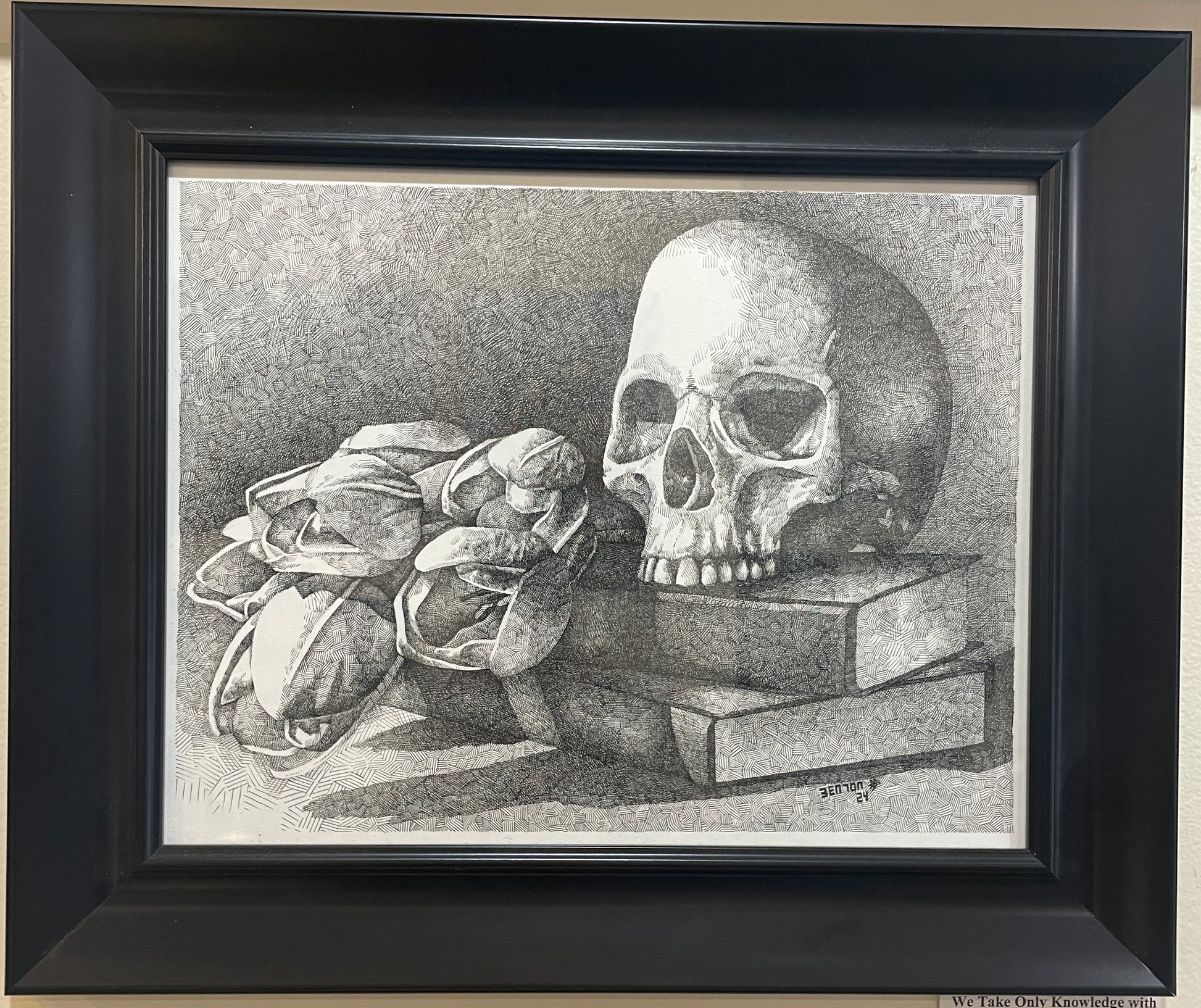 R. Benton Brown is an artist of many talents. From film to 2D painting, his work is one that presents themes of life and death with a masterful approach to capturing light. His Memento Mori collection spans several years and is an ongoing study of the human skull in oil, gouache, watercolor and block print. Flowers and shadows are often present in his works and evoke emotion intertwined with skilled technique. From studies to large scale works, R. Benton Brown’s paintings are ones to treasure.